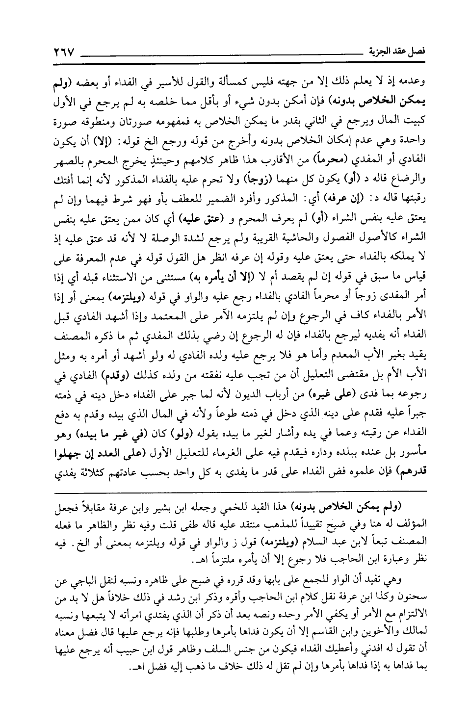 وهي تفيد أن الواو للجمع على بابها وقد قرره في ضيح على ظاهره ونسبه لنقل الباجي عن سحنون وكذا ابن عرفة نقل كلام ابن الحاجب وأقره وذكر ابن رشد في ذلك خلافًا هل لا بد من الالتزام مع الأمر أو يكفي الأمر وحده ونصه بعد أن ذكر أن الذي يفتدي امرأته لا يتبعها ونسبه لمالك والأخوين وابن القاسم إلا أن يكون فداها بأمرها وطلبها فإنه يرجع عليها قال فضل معناه أن تقول له افدني وأعطيك الفداء فيكون من حسن السلف وظاهر قول ابن حبيب أنه يرجع عليها بما فداها به إذا فداها بأمرها وإن لم تقل له ذلك خلاف ما ذهب إليه فضل اهـ.