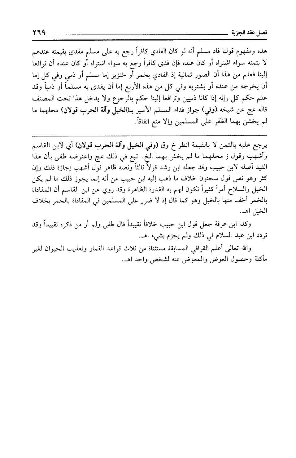هذه ومفهوم قولنا فاد مسلم أنه لو كان الفادي كافرًا رجع به على مسلم مفدى بقيمته عندهم لا بثمنه سواء اشتراه أو كان عنده فإن فدى كافرًا رجع به سواء اشتراه أو كان عنده أن ترافعا إلينا فعلم من هذا أن الصور ثمانية إذ الفادي بخمر أو خنزير إما مسلم أو ذمي وفي كل إما أن يخرجه من عنده أو يشتريه وفي كل من هذه الأربع إما أن يفدى به مسلمًا أو ذميًّا وقد علم حكم كل وإنه إذا كانا ذميين وترافعا إلينا حكم بالرجوع ولا يدخل هذا تحت المصنف قاله عج عن شيخه (وفي) جواز فداء المسلم الأسير بـ (الخيل وآلة الحرب قولان) محلهما ما لم يخشن بهما الظفر على المسلمين وإلا منع اتفاقًا.