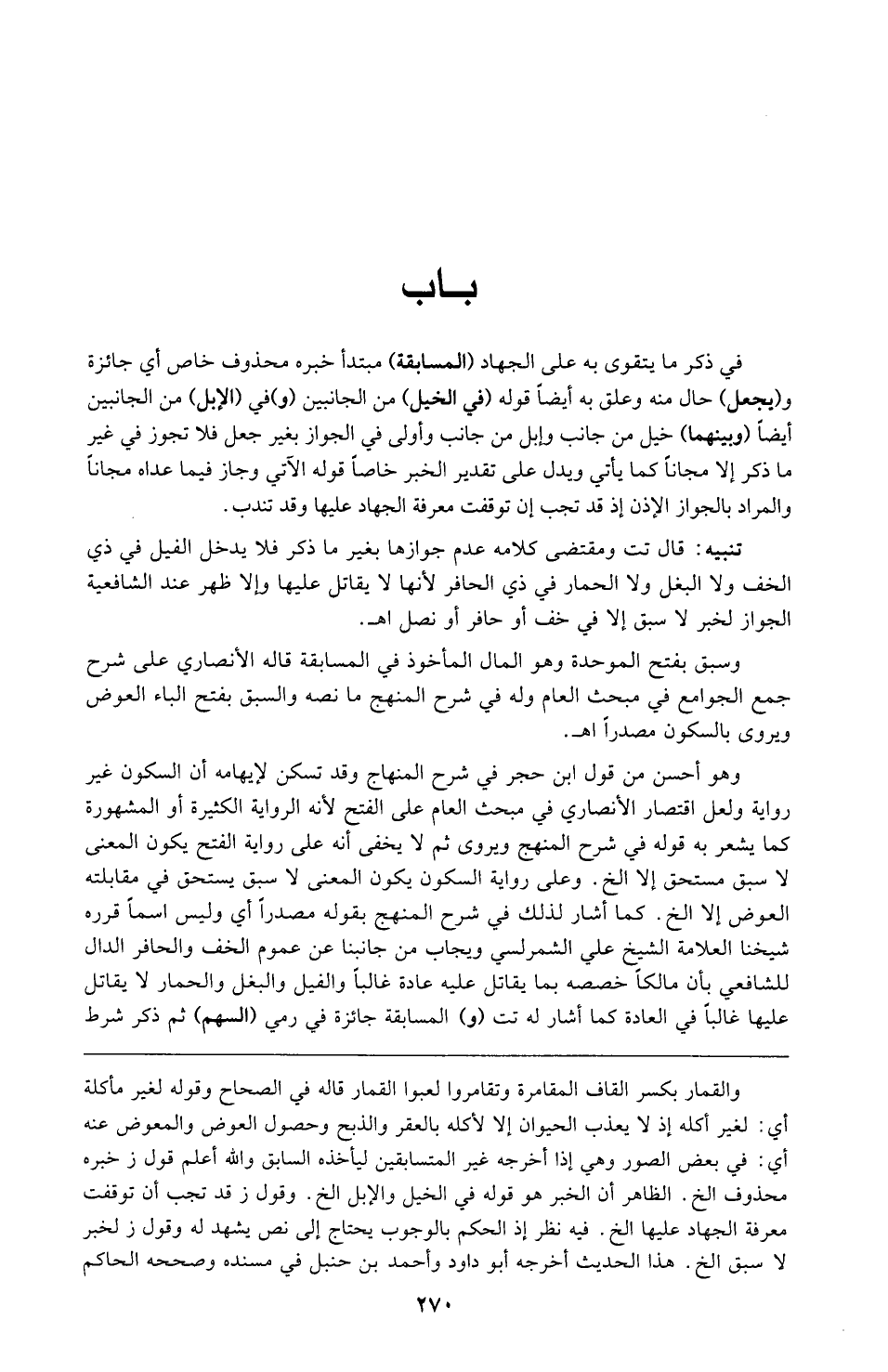 وهو أحسن من قول ابن حجر في شرح المنهاج وقد تسكن لإيهامه أن السكون غير رواية ولعل اقتصار الأنصاري في مبحث العام على الفتح لأنه الرواية الكثيرة أو المشهورة كما يشعر به قوله في شرح المنهج ويروى ثم لا يخفى أنه على رواية الفتح يكون المعنى لا سبق مستحق إلا الخ. وعلى رواية السكون يكون المعنى لا سبق يستحق في مقابلته العوض إلا الخ. كما أشار لذلك في شرح المنهج بقوله مصدرًا أي وليس اسمًا قرره شيخنا العلامة الشيخ علي الشمرلسي ويجاب من جانبنا عن عموم الخف والحافر الدال للشافعي بأن مالكًا خصصه بما يقاتل عليه عادة غالبًا والفيل والبغل والحمار لا يقاتل عليها غالبًا في العادة كما أشار له تت (و) المسابقة جائزة في رمي (السهم) ثم ذكر شرط