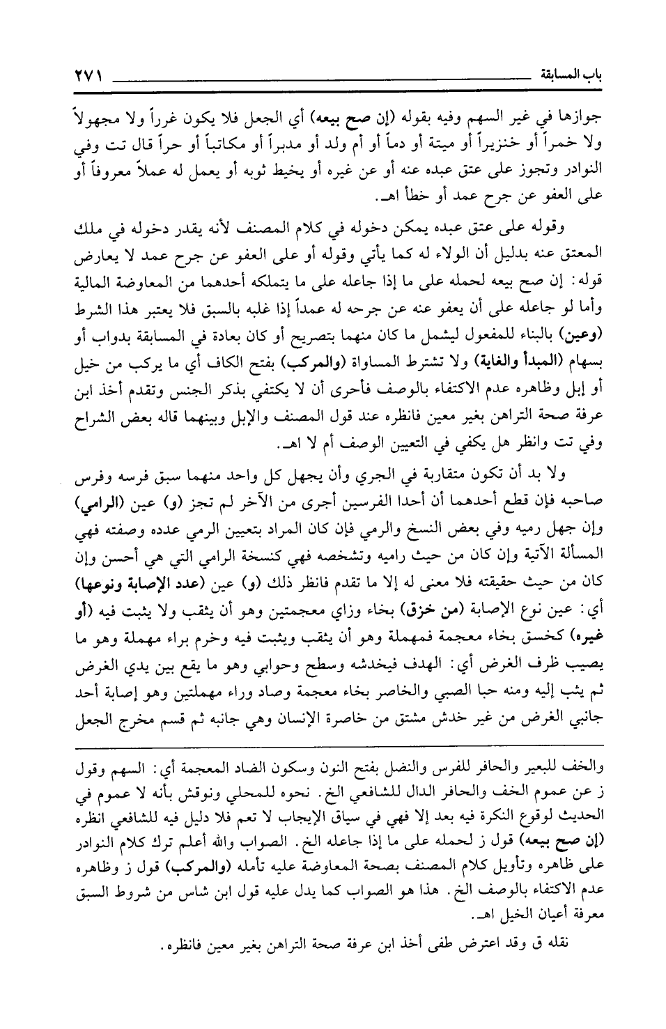 والخف للبعير والحافر للفرس والنضل بفتح النون وسكون الضاد المعجمة أي: السهم وقول ز عن عموم الخف والحافر الدال للشافعي الخ. نحوه للمحلي ونوقش بأنه لا عموم في الحديث لوقوع النكرة فيه بعد إلا فهي في سياق الإيجاب لا تعم فلا دليل فيه للشافعي انظره (إن صح بيعه) قول ز لحمله على ما إذا جاعله الخ. الصواب والله أعلم ترك كلام النوادر على ظاهره وتأويل كلام المصنف بصحة المعاوضة عليه تأمله (والمركب) قول ز وظاهره عدم الاكتفاء بالوصف الخ. هذا هو الصواب كما يدل عليه قول ابن شاس من شروط السبق معرفة أعيان الخيل اهـ.