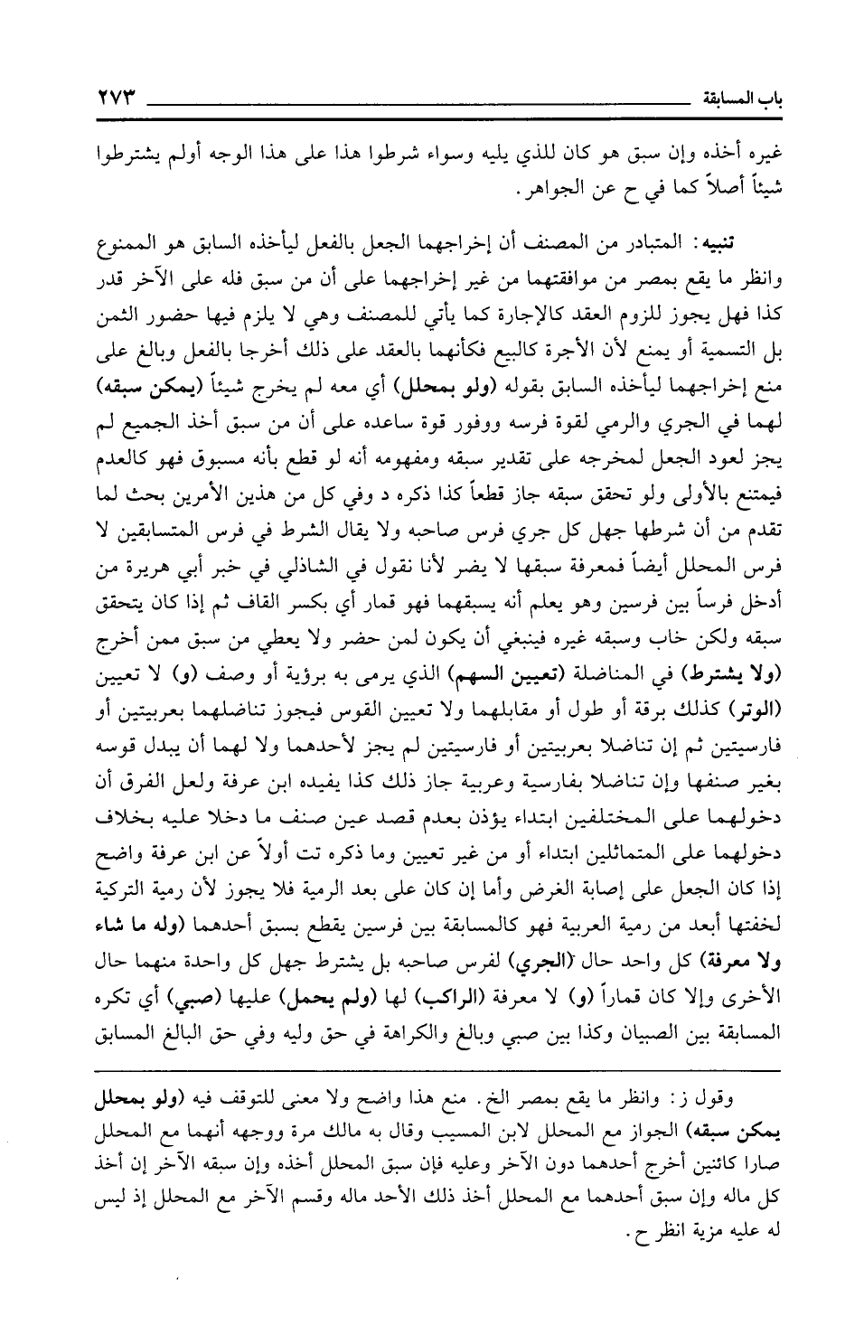 وقول ز: وانظر ما يقع بمصر الخ. منع هذا واضح ولا معنى للتوقف فيه (ولو بمحلل يمكن سبقه) الجواز مع المحلل لابن المسيب وقال به مالك مرة ووجهه أنهما مع المحلل صارا كائنين أخرج أحدهما دون الآخر وعليه فإن سبق المحلل أخذه وإن سبقه الآخر إن أخذ كل ماله وإن سبق أحدهما مع المحلل أخذ ذلك الأحد ماله وقسم الآخر مع المحلل إذ ليس له عليه مزية انظر ح.