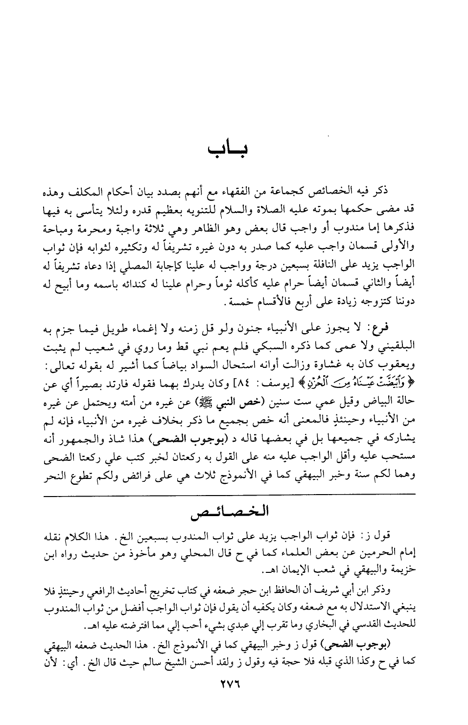 فرع: لا يجوز على الأنبياء جنون ولو قل زمنه ولا إغماء طويل فيما جزم به البلقيني ولا عمى كما ذكره السبكي فلم يعم نبي قط وما روي في شعيب لم يثبت ويعقوب كان به غشاوة وزالت أوانه استحال السواد بياضًا كما أشير له بقوله تعالى: {وَابْيَضَّتْ عَيْنَاهُ مِنَ الْحُزْنِ} [يوسف: 84] وكان يدرك بهما فقوله فارتد بصيرًا أي عن حالة البياض وقيل عمي ست سنين (خص النبي - صلى الله عليه وسلم -) عن غيره من أمته ويحتمل عن غيره من الأنبياء وحينئذ فالمعنى أنه خص بجميع ما ذكر بخلاف غيره من الأنبياء فإنه لم يشاركه في جميعها بل في بعضها قاله د (بوجوب الضحى) هذا شاذ والجمهور أنه مستحب عليه وأقل الواجب عليه منه على القول به ركعتان لخبر كتب علي ركعتا الضحى وهما لكم سنة وخبر البيهقي كما في الأنموذج ثلاث هي على فرائض ولكم تطوع النحر