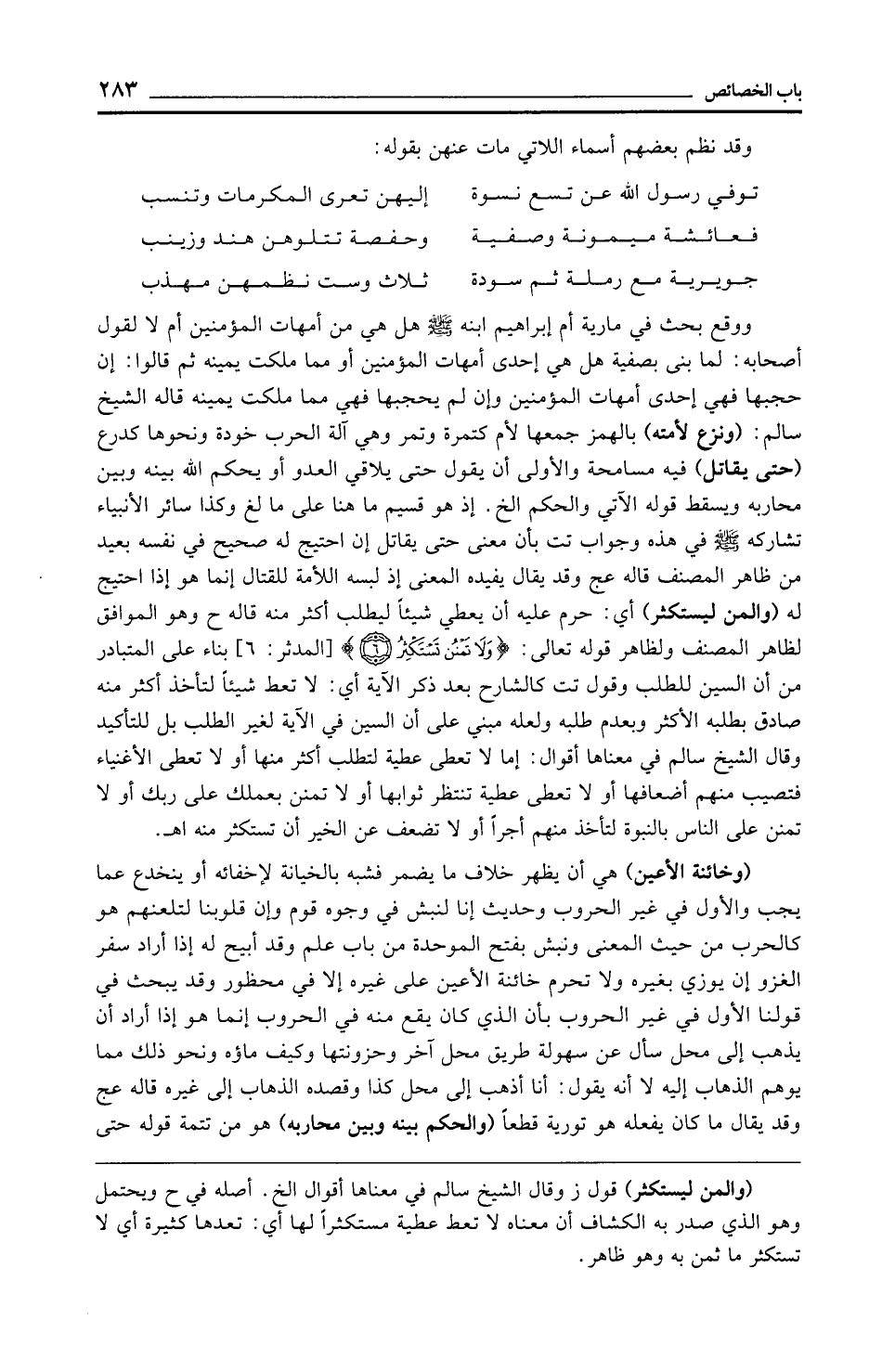 ووقع بحث في مارية أم إبراهيم ابنه - صلى الله عليه وسلم - هل هي من أمهات المؤمنين أم لا لقول أصحابه: لما بنى بصفية هل هي إحدى أمهات المؤمنين أو مما ملكت يمينه ثم قالوا: إن حجبها فهي إحدى أمهات المؤمنين وإن لم يحجبها فهي مما ملكت يمينه قاله الشيخ سالم: (ونزع لأمته) بالهمز جمعها لأم كتمرة وتمر وهي آلة الحرب خودة ونحوها كدرع (حتى يقاتل) فيه مسامحة والأولى أن يقول حتى يلاقي العدو أو يحكم الله بينه وبين محاربه ويسقط قوله الآتي والحكم الخ. إذ هو قسيم ما هنا على ما لغ وكذا سائر الأنبياء تشاركه - صلى الله عليه وسلم - في هذه وجواب تت بأن معنى حتى يقاتل إن احتيج له صحيح في نفسه بعيد من ظاهر المصنف قاله عج وقد يقال يفيده المعنى إذ لبسه اللأمة للقتال إنما هو إذا احتيج له (والمن ليستكثر) أي: حرم عليه أن يعطي شيئًا ليطلب أكثر منه قاله ح وهو الموافق لظاهر المصنف ولظاهر قوله تعالى: {وَلَا تَمْنُنْ تَسْتَكْثِرُ (6)} [المدثر: 6] بناء على المتبادر من أن السين للطلب وقول تت كالشارح بعد ذكر الآية أي: لا تعط شيئًا لتأخذ أكثر منه صادق بطلبه الأكثر وبعدم طلبه ولعله مبني على أن السين في الآية لغير الطلب بل للتأكيد وقال الشيخ سالم في معناها أقوال: إما لا تعطى عطية لتطلب أكثر منها أو لا تعطى الأغنياء فتصيب منهم أضعافها أو لا تعطى عطية تنتظر ثوابها أو لا تمنن بعملك على ربك أو لا تمنن على الناس بالنبوة لتأخذ منهم أجرًا أو لا تضعف عن الخير أن تستكثر منه اهـ.