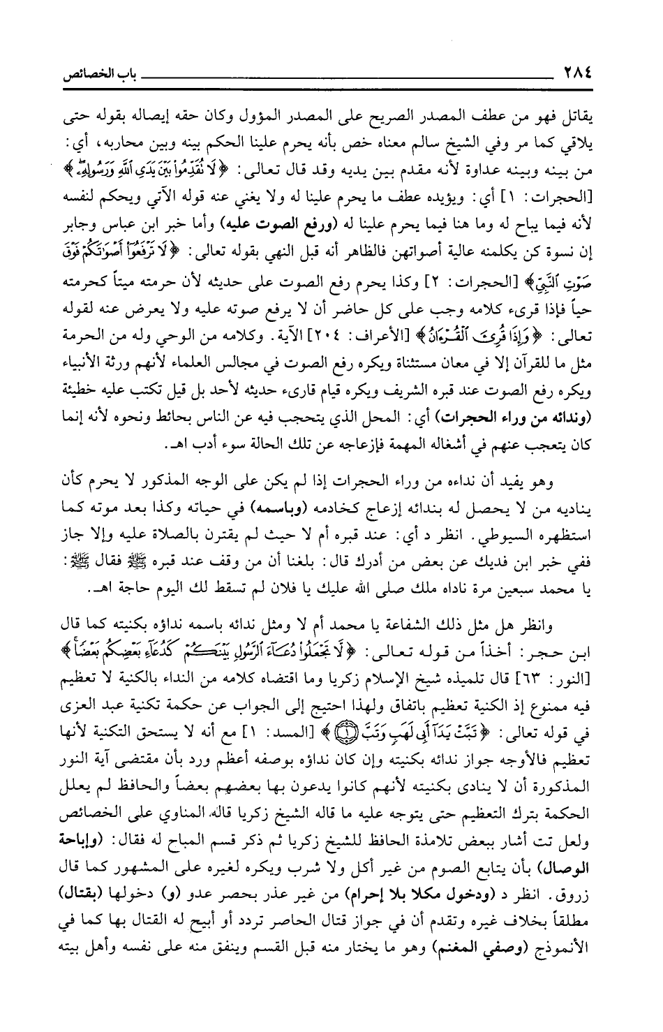 وانظر هل مثل ذلك الشفاعة يا محمَّد أم لا ومثل ندائه باسمه نداؤه بكنيته كما قال ابن حجر: أخذًا من قوله تعالى: {لَا تَجْعَلُوا دُعَاءَ الرَّسُولِ بَيْنَكُمْ كَدُعَاءِ بَعْضِكُمْ بَعْضًا} [النور: 63] قال تلميذه شيخ الإِسلام زكريا وما اقتضاه كلامه من النداء بالكنية لا تعظيم فيه ممنوع إذ الكنية تعظيم باتفاق ولهذا احتيج إلى الجواب عن حكمة تكنية عبد العزى في قوله تعالى: {تَبَّتْ يَدَا أَبِي لَهَبٍ وَتَبَّ (1)} [المسد: 1] مع أنه لا يستحق التكنية لأنها تعظيم فالأوجه جواز ندائه بكنيته وإن كان نداؤه بوصفه أعظم ورد بأن مقتضى آية النور المذكورة أن لا ينادى بكنيته لأنهم كانوا يدعون بها بعضهم بعضًا والحافظ لم يعلل الحكمة بترك التعظيم حتى يتوجه عليه ما قاله الشيخ زكريا قاله د المناوي على الخصائص ولعل تت أشار ببعض تلامذة الحافظ للشيخ زكريا ثم ذكر قسم المباح له فقال: (وإباحة الوصال) بأن يتابع الصوم من غير أكل ولا شرب ويكره لغيره على المشهور كما قال زروق. انظر د (ودخول مكة بلا إحرام) من غير عذر بحصر عدو (و) دخولها (بقتال) مطلقًا بخلاف غيره وتقدم أن في جواز قتال الحاصر تردد أو أبيح له القتال بها كما في الأنموذج (وصفي المغنم) وهو ما يختار منه قبل القسم وينفق منه على نفسه وأهل بيته