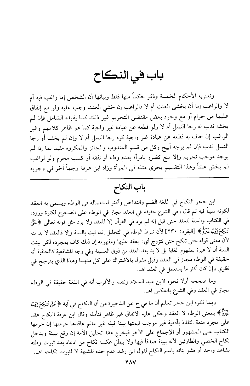 ابن حجر النكاح في اللغة الضم والتداخل وأكثر استعماله في الوطء ويسمى به العقد لكونه سببًا فيه ثم قال وفي الشرع حقيقة في العقد مجاز في الوطء على الصحيح لكثرة وروده في الكتاب والسنة للعقد حتى قيل إنه لم يرد في القرآن إلا للعقد ولا يرد مثل قوله تعالى {حَتَّى تَنْكِحَ زَوْجًا غَيْرَهُ} [البقرة: 230] لأن شرط الوطء في التحليل إنما ثبت بالسنة وإلا فالعقد لا بد منه لأن معنى قوله حتى تنكح حتى تتزوج أي: بعقد عليها ومفهومه إن ذلك كاف بمجرده لكن بينت السنة أن لا عبرة بمفهوم الغاية بل لا بد بعد العقد من ذوق العسيلة وفي وجه للشافعية كالحنفية أنه حقيقة في الوطء مجاز في العقد وقيل مقول بالاشتراك على كل منهما وهذا الذي يترجح في نظري وإن كان أكثر ما يستعمل في العقد اهـ.
