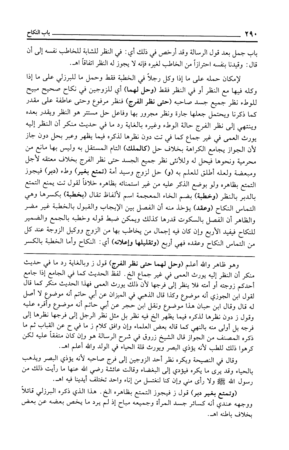 لإمكان حمله على ما إذا وكل رجلًا في الخطبة فقط وحمل ما للبرزلي على ما إذا وكله فيها مع النظر أو في النظر فقط (وحل لهما) أي للزوجين في نكاح صحيح مبيح للوطء نظر جميع جسد صاحبه (حتى نظر الفرج) فنظر مرفوع وحتى عاطفة على مقدر كما ذكرنا ويحتمل جعلها جارة ونظر مجرور بها وفاعل حل مستتر هو النظر ويقدر بعده وينتهي إلى نظر الفرج حالة الوطء وغيره بالغاية رد ما في حديث منكر أن النظر إليه يورث العمى في غير جماع كما في تت دون نظرها لذكره فيما يظهر وعبر بحل دون جاز لأن الجواز يجامع الكراهة بخلاف حل (كالملك) التام المستقل به وليس بها مانع من محرمية ونحوها فيحل له وللأنثى نظر جميع الجسد حتى نظر الفرج بخلاف معتقه لأجل ومبعضة ولعله أطلق للعلم به (و) حل لزوج وسيد أمة (تمتع بغير) وطء (دبر) فيجوز التمتع بظاهره ولو بوضع الذكر عليه من غير استمنائه بظاهره خلافًا لقول تت يمنع التمتع بالدبر بالنظر (وخطبة) بضم الخاء المعجمة اسم لألفاظ تقال (بخطبة) بكسرها وهي التماس النكاح (وعقد) يؤخذ منه أن الفصل بين الإيجاب والقبول بالخطبة غير مضر والظاهر أن الفصل بالسكوت قدرها كذلك ويمكن ضبط قوله وخطبه بالجمع والضمير للنكاح فيفيد الأربع وإن كان فيه إجمال من يخاطب بها من الزوج ووكيل الزوجة عند كل من التماس النكاح وعقده فهي أربع (وتقليلها وإعلانه) أي: النكاح وأما الخطبة بالكسر