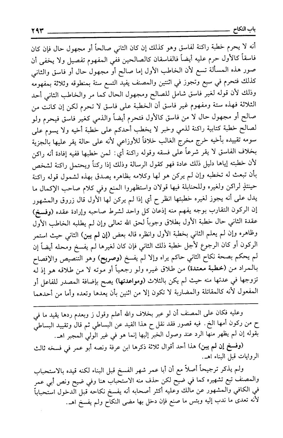 ولم يذكر ترجيحًا أصلًا مع أن أبا عمر شهر الفسخ قبل البناء لكنه قيده بالاستحباب والمصنف تبع تشهيره كما في ضيح لكن حذف منه الاستحباب هنا وفي ضيح ونص أبي عمر في الكافي والمشهور عن مالك وعليه أكثر أصحابه أنه يفسخ نكاحه قبل الدخول استحبابًا لأنه تعدى ما ندب إليه وبئس ما صنع فإن دخل بها مضى النكاح ولم يفسخ اهـ.