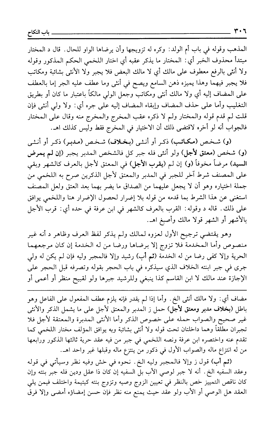 المذهب وقوله في باب أم الولد: وكره له تزويجها وأن يرضاها الواو للحال. قال د المختار مبتدأ محذوف الخبر أي: المختار ما يذكر عقبه أي اختار اللخمي الحكم المذكور وقوله ولا أنثى بالرفع معطوف على مالك أي لا مالك البعض فلا يجبر ولا الأنثى بشائبة ومكاتب فلا يجبر فيهما وهذا يميزه ذهن السامع ويصح في أنثى وما عطف عليه الجر إما بالعطف على المضاف إليه أي ولا مالك أنثى ومكاتب وجعل الولي مالكًا باعتبار ما كان أو بطريق التغليب وأما على حذف المضاف وإبقاء المضاف إليه على جره أي: ولا ولي أنثى فإن قلت لم قدم قوله والمختار ولم لا ذكره عقب المخرج والمخرج منه وقال على المختار فالجواب أنه لو أخره لاقتضى ذلك أن الاختيار في المخرج فقط وليس كذلك اهـ.