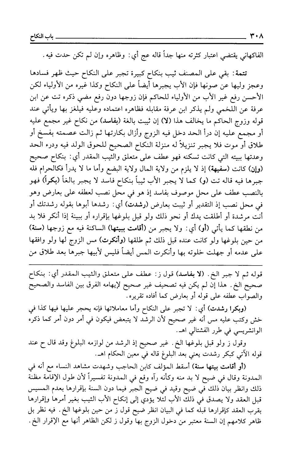 تتمة: بقي على المصنف ثيب بنكاح كبيرة تجبر على النكاح حيث ظهر فسادها وعجز وليها عن صونها فإن الأب يجبرها أيضًا على النكاح وكذا غيره من الأولياء لكن الأحسن رفع غير الأب من الأولياء للحاكم فإن زوجها دون رفع مضي ذكره تت عن ابن عرفة عن اللخمي ولم يذكر ابن عرفة مقابله فظاهره اعتماده وعليه فيلغز بها ويأتي عند قوله وزوج الحاكم ما يخالف هذا (لا) إن ثيبت بالغة (بفاسد) من نكاح غير مجمع عليه أو مجمع عليه إن درأ الحد دخل فيه الزوج وأزال بكارتها ثم زالت عصمته بفسخ أو طلاق أو موت فلا يجبر تنزيلًا له منزلة النكاح الصحيح للحوق الولد فيه ودرء الحد وعدتها ببيته التي كانت تسكنه فهو عطف على متعلق والثيب المقدر أي: بنكاح صحيح (وإن) كانت (سفيهة) إذ لا يلزم من ولاية المال ولاية البضع وأما ما لا يدرأ فكالحرام فله جبرها فيه قاله تت (و) كما لا يجبر الأب ثيبًا بنكاح فاسد لا يجبر بالغًا (بكرًا) فهو بالنصب عطف على محل موصوف بفاسد إذ هو في محل نصب لعطفه على بعارض وهو في محل نصب إذ التقدير أو ثيبت بعارض (رشدت) أي: رشدها أبوها بقوله رشدتك أو أنت مرشدة أو أطلقت يدك أو نحو ذلك ولو قبل بلوغها بإقراره أو ببينة إذا أنكر فلا بد من نطقها كما يأتي (أو) أي: ولا يجبر من (أقامت ببيتها) الساكنة فيه مع زوجها (سنة) من حين بلوغها ولو كانت عنده قبل ذلك ثم طلقها (وأنكرت) مس الزوج لها ولو وافقها على عدمه أو جهلت خلوته بها وأنكرت المس أيضًا فليس لأبيها جبرها بعد طلاق من