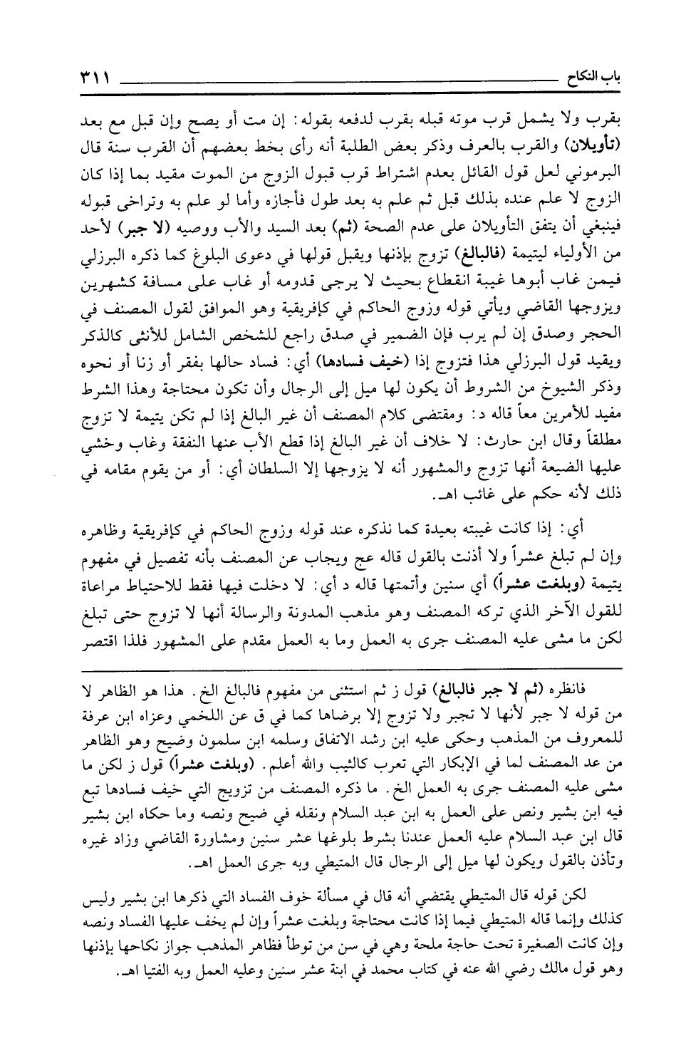 فانظره (ثم لا جبر فالبالغ) قول ز ثم استثنى من مفهوم فالبالغ الخ. هذا هو الظاهر لا من قوله لا جبر لأنها لا تجبر ولا تزوج إلا برضاها كما في ق عن اللخمي وعزاه ابن عرفة للمعروف من المذهب وحكى عليه ابن رشد الاتفاق وسلمه ابن سلمون وضيح وهو الظاهر من محمد المصنف لما في الإبكار التي تعرب كالثيب والله أعلم. (وبلغت عشرًا) قول ز لكن ما مشى عليه المصنف جرى به العمل الخ. ما ذكره المصنف من تزويج التي خيف فسادها تبع فيه ابن بشير ونص على العمل به ابن عبد السلام ونقله في ضيح ونصه وما حكاه ابن بشير قال ابن عبد السلام عليه العمل عندنا بشرط بلوغها عشر سنين ومشاورة القاضي وزاد غيره وتأذن بالقول ويكون لها ميل إلى الرجال قال المتيطي وبه جرى العمل اهـ.