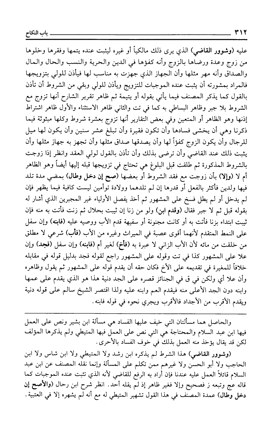 عليه (وشوور القاضي) الذي يرى ذلك مالكيًّا أو غيره ليثبت عنده يتمها وفقرها وخلوها من زوج وعدة ورضاها بالزوج وأنه كفؤها في الدين والحرية والنسب والحال والمال والصداق وأنه مهر مثلها وأن الجهاز الذي جهزت به مناسب لها فيأذن للولي بتزويجها فالمراد بمشورته أن يثبت عنده الموجبات للتزويج ويأذن للولي وبقي من الشروط أن تأذن بالقول كما يذكر المصنف فيما يأتي بقوله أو يتيمة ثم ظاهر تقرير الشارح أنها تزوج مع الشروط بلا جبر وظاهر البساطي به كما في تت والثاني ظاهر الاستثناء والأول ظاهر اشتراط إذنها وهو الظاهر أو المتعين وفي بعض التقارير أنها تزوج بعشرة شروط وكلها مبثوثة فيما ذكرنا وهي أن يخشى فسادها وأن تكون فقيرة وأن تبلغ عشر سنين وأن يكون لها ميل للرجال وأن يكون الزوج كفؤًا لها وأن يصدقها صداق مثلها وأن تجهز به جهاز مثلها وأن يثبت ذلك عند القاضي وأن ترضى بذلك وأن تأذن بالقول لولي العقد وانظر إذا زوجت بالشروط المذكورة ثم طلقت قبل البلوغ هي تحتاج في تزويجها قبله إليها أيضًا وهو الظاهر أم لا (وإلا) بأن زوجت مع فقد الشروط أو بعضها (صح إن دخل وطال) بمضي مدة تلد فيها ولدين فأكثر بالفعل أو قدرها إن لم تلدهما وولادة توأمين ليست كافية فيما يظهر فإن لم يدخل أو لم يطل فسخ على المشهور ثم أخذ يفصل الأولياء غير المجبرين الذي أشار له بقوله قبل ثم لا جبر فقال (وقدم ابن) ولو من زنا إن ثيبت بحلال ثم زنت فأتت به منه فإن ثيبت ابتداء بزنا فأتت به أو كانت مجنونة أو سفيهة قدم الأب ووصيه عليه (فابنه) وإن سفل على النمط المتقدم لأنهما أقوى عصبة في الميراث وغيره من الأب (فأب) شرعي لا مطلق من خلقت من مائه لأن الأب الزاني لا عبرة به (فأخ) لغير أم (فابنه) وإن سفل (فجد) وإن علا على المشهور كذا في تت وقوله على المشهور راجع لقوله فجد بدليل قوله في مقابله خلافًا للمغيرة في تقديمه على الأخ فكان حقه أن يقدم قوله على المشهور ثم يقول وظاهره وأن علا ولكن في ق في الجنائز قصره على الجد دنية هذا هو الذي يقدم على عمها وابنه دون الجد الأعلى منه فيقدم العم وابنه عليه ولذا اقتصر الشيخ سالم على قوله دنية ويقدم الأقرب من الأجداد فالأقرب ويجري نحوه في قوله فابنه.
