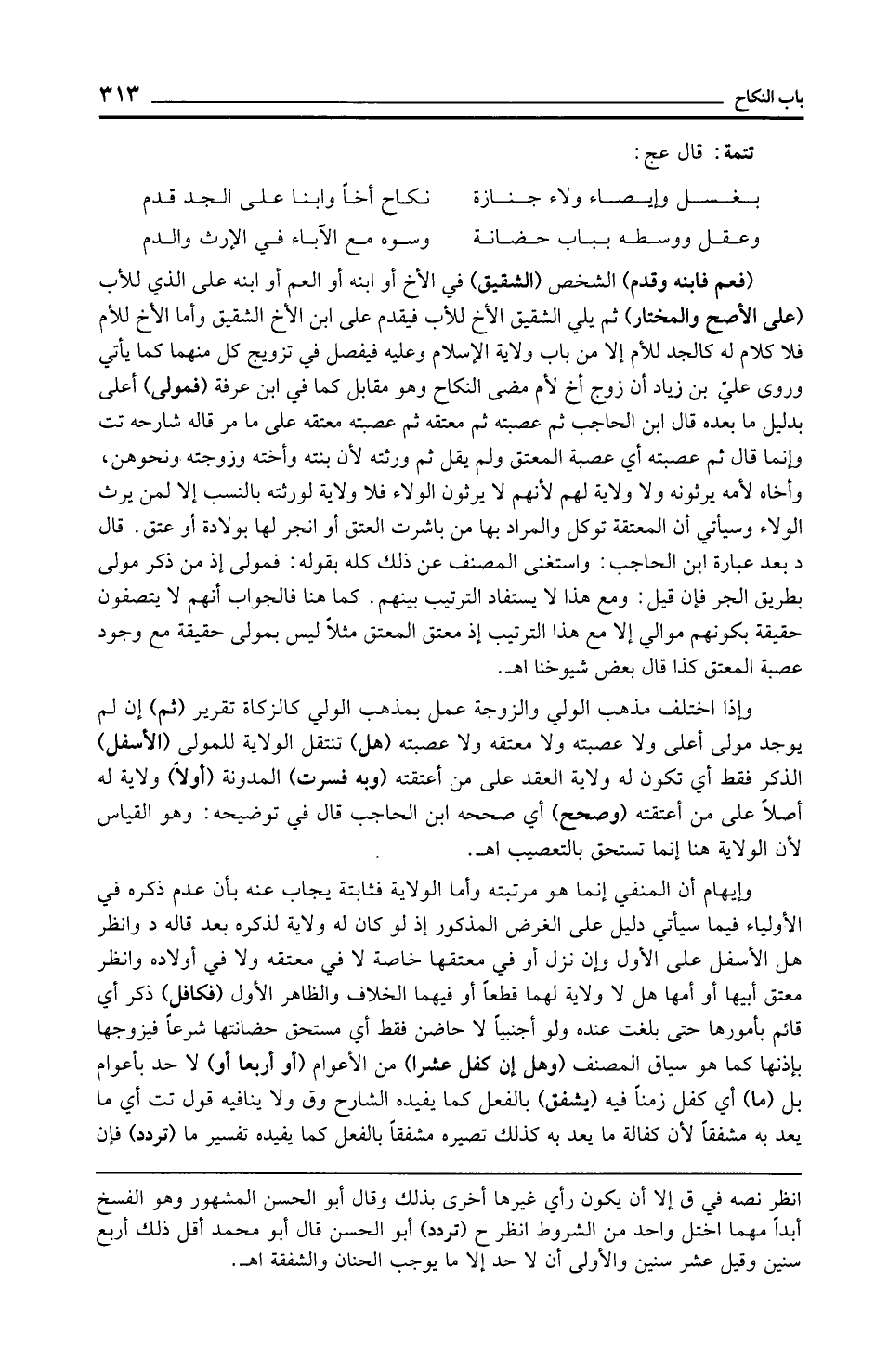 (فعم فابنه وقدم) الشخص (الشقيق) في الأخ أو ابنه أو العم أو ابنه على الذي للأب (على الأصح والمختار) ثم يلي الشقيق الأخ للأب فيقدم على ابن الأخ الشقيق وأما الأخ للأم فلا كلام له كالجد للأم إلا من باب ولاية الإسلام وعليه فيفصل في تزويج كل منهما كما يأتي وروى عليّ بن زياد أن زوج أخ لأم مضى النكاح وهو مقابل كما في ابن عرفة (فمولى) أعلى بدليل ما بعده قال ابن الحاجب ثم عصبته ثم معتقه ثم عصبته معتقه على ما مر قاله شارحه تت وإنما قال ثم عصبته أي عصبة المعتق ولم يقل ثم ورثته لأن بنته وأخته وزوجته ونحوهن، وأخاه لأمه يرثونه ولا ولاية لهم لأنهم لا يرثون الولاء فلا ولاية لورثته بالنسب إلا لمن يرث الولاء وسيأتي أن المعتقة توكل والمراد بها من باشرت العتق أو انجر لها بولادة أو عتق. قال د بعد عبارة ابن الحاجب: واستغنى المصنف عن ذلك كله بقوله: فمولى إذ من ذكر مولى بطريق الجر فإن قيل: ومع هذا لا يستفاد الترتيب بينهم. كما هنا فالجواب أنهم لا يتصفون حقيقة بكونهم موالي إلا مع هذا الترتيب إذ معتق المعتق مثلًا ليس بمولى حقيقة مع وجود عصبة المعتق كذا قال بعض شيوخنا اهـ.