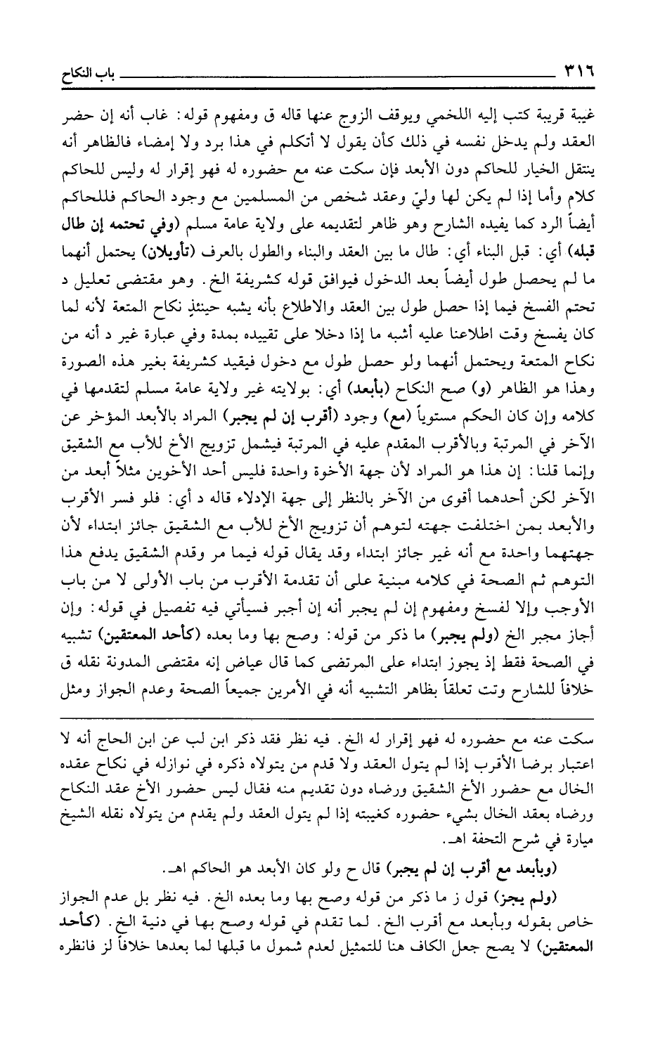 غيبة قريبة كتب إليه اللخمي ويوقف الزوج عنها قاله ق ومفهوم قوله: غاب أنه إن حضر العقد ولم يدخل نفسه في ذلك كأن يقول لا أتكلم في هذا برد ولا إمضاء فالظاهر أنه ينتقل الخيار للحاكم دون الأبعد فإن سكت عنه مع حضوره له فهو إقرار له وليس للحاكم كلام وأما إذا لم يكن لها وليّ وعقد شخص من المسلمين مع وجود الحاكم فللحاكم أيضًا الرد كما يفيده الشارح وهو ظاهر لتقديمه على ولاية عامة مسلم (وفي تحتمه إن طال قبله) أي: قبل البناء أي: طال ما بين العقد والبناء والطول بالعرف (تأويلان) يحتمل أنهما ما لم يحصل طول أيضًا بعد الدخول فيوافق قوله كشريفة الخ. وهو مقتضى تعليل د تحتم الفسخ فيما إذا حصل طول بين العقد والاطلاع بأنه يشبه حينئذٍ نكاح المتعة لأنه لما كان يفسخ وقت اطلاعنا عليه أشبه ما إذا دخلا على تقييده بمدة وفي عبارة غير د أنه من نكاح المتعة ويحتمل أنهما ولو حصل طول مع دخول فيقيد كشريفة بغير هذه الصورة وهذا هو الظاهر (و) صح النكاح (بأبعد) أي: بولايته غير ولاية عامة مسلم لتقدمها في كلامه وإن كان الحكم مستويًا (مع) وجود (أقرب إن لم يجبر) المراد بالأبعد المؤخر عن الآخر في المرتبة وبالأقرب المقدم عليه في المرتبة فيشمل تزويج الأخ للأب مع الشقيق وإنما قلنا: إن هذا هو المراد لأن جهة الأخوة واحدة فليس أحد الأخوين مثلًا أبعد من الآخر لكن أحدهما أقوى من الآخر بالنظر إلى جهة الإدلاء قاله د أي: فلو فسر الأقرب والأبعد بمن اختلفت جهته لتوهم أن تزويج الأخ للأب مع الشقيق جائز ابتداء لأن جهتهما واحدة مع أنه غير جائز ابتداء وقد يقال قوله فيما مر وقدم الشقيق يدفع هذا التوهم ثم الصحة في كلامه مبنية على أن تقدمة الأقرب من باب الأولى لا من باب الأوجب وإلا لفسخ ومفهوم إن لم يجبر أنه إن أجبر فسيأتي فيه تفصيل في قوله: وإن أجاز مجبر الخ (ولم يجبر) ما ذكر من قوله: وصح بها وما بعده (كأحد المعتقين) تشبيه في الصحة فقط إذ يجوز ابتداء على المرتضى كما قال عياض إنه مقتضى المدونة نقله في خلافًا للشارح وتت تعلقًا بظاهر التشبيه أنه في الأمرين جميعًا الصحة وعدم الجواز ومثل