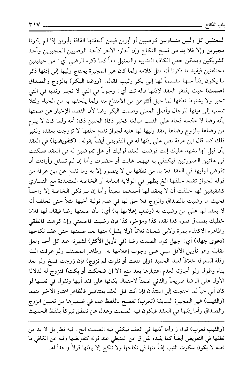 المعتقين كل وليين متساويين كوصيين أو أبوين فيمن ألحقتها القافة بأبوين إذا لم يكونا مجبرين وإلا فلا بد من فسخ النكاح وإن أجازه الآخر كأحد الوصيين المجبرين وأحد الشريكين ويمكن جعل الكاف التشبيه والتمثيل معًا كما ذكره الرضي أي: من حيثيتين مختلفتين فيفيد ما ذكرنا أنه مثل كلامه ولما كان غير المجبرة يحتاج وليها إلى إذنها ذكر ما يكون إذنًا منها مقسمًا لها إلى بكر وثيب فقال: (ورضا البكر) بالزوج والصداق (صمت) حيث يفتقر العقد لإذنها قاله تت أي: وجوبًا في التي لا تجبر وندبا في التي تجبر ولا يشترط نطقها لما جبل أكثرهن من الامتناع منه ولما يلحقها به من الحياء ولئلا تنسب إلى ميلها للرجال وأصل المعنى وصمت البكر رضا لأن القصد الإخبار عن صمتها بأنه رضا لا عكسه فجاء على القلب مبالغة كخبر ذكاة الجنين ذكاة أمه ولما كان لا يلزم من رضاها بالزوج رضاها بعقد وليها لها عليه لجواز تقدم حلفها لا تزوجت بعقده ولغير ذلك كما قال ابن عرفة نص على إذنها له في التفويض أيضًا بقوله: (كتفويضها) في العقد بأن قيل لها نشهد عليك إنك فوضت العقد لوليك أو هل تفوضين له في العقد فسكتت في هاتين الصورتين فيكتفي به فيهما غابت أو حضرت وأما إن لم تسئل وأرادت أن تفوض لوليها في العقد فلا بد من نطقها بل لا يتصور إلا به وما تقدم عن ابن عرفة من قوله لجواز تقدم حلفها الخ يظهر في الولاية العامة أو الخاصة المتعددة مع التساوي كشقيقين لها حلفت أن لا يعقد لها أحدهما معينًا وأما إن لم تكن الخاصة إلا واحدًا فحيث ما رضيت بالصداق والزوج فلا حق لها في عدم تولية أخيها مثلًا حتى تحلف أنه لا يعقد لها على من رضيت به (وندب إعلامها به) أي: بأن صمتها رضا فيقال لها فلان خطبك بصداق قدره كذا نقده كذا ومؤخره كذا فإن رضيت فاصمتي وإن كرهت فانطقي وظاهره الاكتفاء بمرة ولابن شعبان ثلاثًا (ولا يقبل) منها بعد صمتها حتى عقد نكاحها (دعوى جهله) أي: جهل كون الصمت رضا (في تأويل الأكثر) لشهرته عند كل أحد ولعل مقابله وهو تأويل الأقل مبني على وجوب إعلامها به. وظاهر المصنف ولو عرفت البله وقلة المعرفة خلافًا لعبد الحميد (وإن منعت أو نفرت لم تزوج) فإن زوجت فسخ ولو بعد بناء وطول ولو أجازته لعدم اعتبارها بعد منع (لا إن ضحكت أو بكت) فتزوج له لدلالة الأول على الرضا صريحًا والثاني ضمنًا لاحتمال بكائها على فقد أبيها وتقول في نفسها لو كان أبي حيًّا لما احتجت إلى استئذان فإن أتت قبل العقد بمتنافيين فالظاهر اعتبار الأخير منهما (والثيب) غير المجبرة السابقة (تعرب) تفصح باللفظ عما في ضميرها من تعيين الزوج والصداق وأما إذنها في العقد فيكون فيه الصمت وعدل عن تنطق تبركًا بلفظ الحديث
