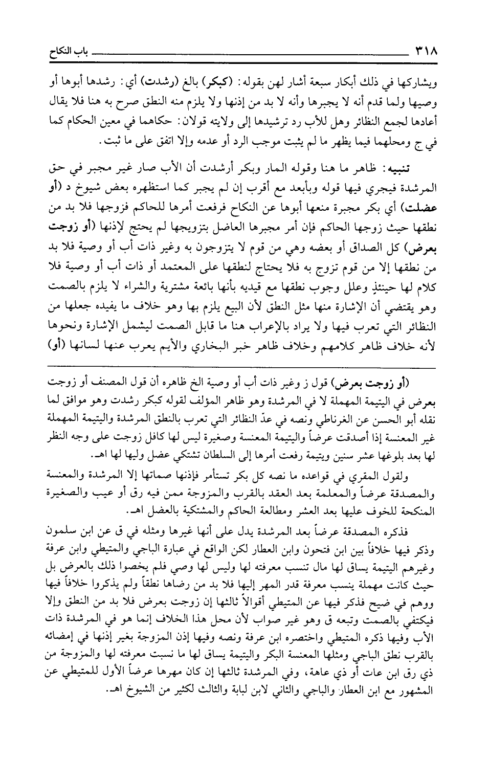 فذكره المصدقة عرضًا بعد المرشدة يدل على أنها غيرها ومثله في ق عن ابن سلمون وذكر فيها خلافًا بين ابن فتحون وابن العطار لكن الواقع في عبارة الباجي والمتيطي وابن عرفة وغيرهم اليتيمة يساق لها مال تنسب معرفته لها وليس لها وصي فلم يخصوا ذلك بالعرض بل حيث كانت مهملة ينسب معرفة قدر المهر إليها فلا بد من رضاها نطقًا ولم يذكروا خلافًا فيها ووهم في ضيح فذكر فيها عن المتيطي أقوالًا ثالثها إن زوجت بعرض فلا بد من النطق وإلا فيكتفي بالصمت وتبعه ق وهو غير صواب لأن محل هذا الخلاف إنما هو في المرشدة ذات الأب وفيها ذكره المتيطي واختصره ابن عرفة ونصه وفيها إذن المزوجة بغير إذنها في إمضائه بالقرب نطق الباجي ومثلها المعنسة البكر واليتيمة يساق لها ما نسبت معرفته لها والمزوجة من ذي رق ابن عات أو ذي عاهة، وفي المرشدة ثالثها إن كان مهرها عرضًا الأول للمتيطي عن المشهور مع ابن العطار والباجي والثاني لابن لبابة والثالث لكثير من الشيوخ اهـ.