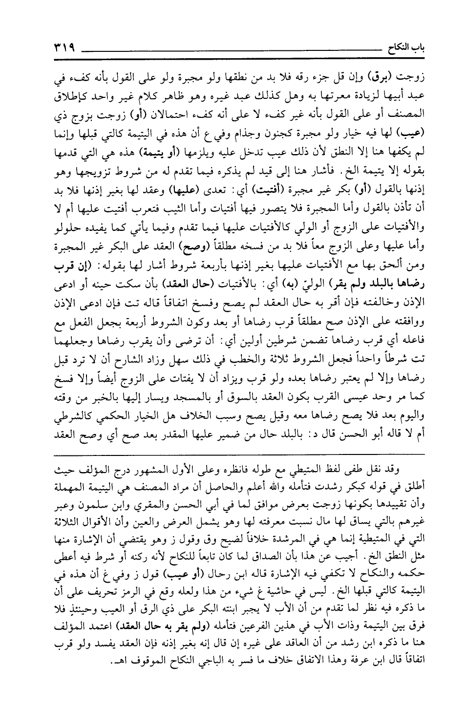 زوجت (برق) وإن قل جزء رقه فلا بد من نطقها ولو مجبرة ولو على القول بأنه كفء في عبد أبيها لزيادة معرتها به وهل كذلك عبد غيره وهو ظاهر كلام غير واحد كإطلاق المصنف أو على القول بأنه غير كفء لا على أنه كفء احتمالان (أو) زوجت بزوج ذي (عيب) لها فيه خيار ولو مجبرة كجنون وجذام وفي ع أن هذه في اليتيمة كالتي قبلها وإنما لم يكفها هنا إلا النطق لأن ذلك عيب تدخل عليه ويلزمها (أو يتيمة) هذه هي التي قدمها بقوله إلا يتيمة الخ. فأشار هنا إلى قيد لم يذكره فيما تقدم له من شروط تزويجها وهو إذنها بالقول (أو) بكر غير مجبرة (أفتيت) أي: تعدى (عليها) وعقد لها بغير إذنها فلا بد أن تأذن بالقول وأما المجبرة فلا يتصور فيها أفتيات وأما الثيب فتعرب أفتيت عليها أم لا والأفتيات على الزوج أو الولي كالأفتيات عليها فيما تقدم وفيما يأتي كما يفيده حلولو وأما عليها وعلى الزوج معًا فلا بد من فسخه مطلقًا (وصح) العقد على البكر غير المجبرة ومن ألحق بها مع الأفتيات عليها بغير إذنها بأربعة شروط أشار لها بقوله: (إن قرب رضاها بالبلد ولم يقر) الوليّ (به) أي: بالأفتيات (حال العقد) بأن سكت حينه أو ادعى الإذن وخالفته فإن أقر به حال العقد لم يصح وفسخ اتفاقًا قاله تت فإن ادعى الإذن ووافقته على الإذن صح مطلقًا قرب رضاها أو بعد وكون الشروط أربعة بجعل الفعل مع فاعله أي قرب رضاها تضمن شرطين أولين أي: أن ترضى وأن يقرب رضاها وجعلهما تت شرطًا واحدًا فجعل الشروط ثلاثة والخطب في ذلك سهل وزاد الشارح أن لا ترد قبل رضاها وإلا لم يعتبر رضاها بعده ولو قرب ويزاد أن لا يفتات على الزوج أيضًا وإلا فسخ كما مر وحد عيسى القرب يكون العقد بالسوق أو بالمسجد ويسار إليها بالخبر من وقته واليوم بعد فلا يصح رضاها معه وقيل يصح وسبب الخلاف هل الخيار الحكمي كالشرطي أم لا قاله أبو الحسن قال د: بالبلد حال من ضمير عليها المقدر بعد صح أي وصح العقد