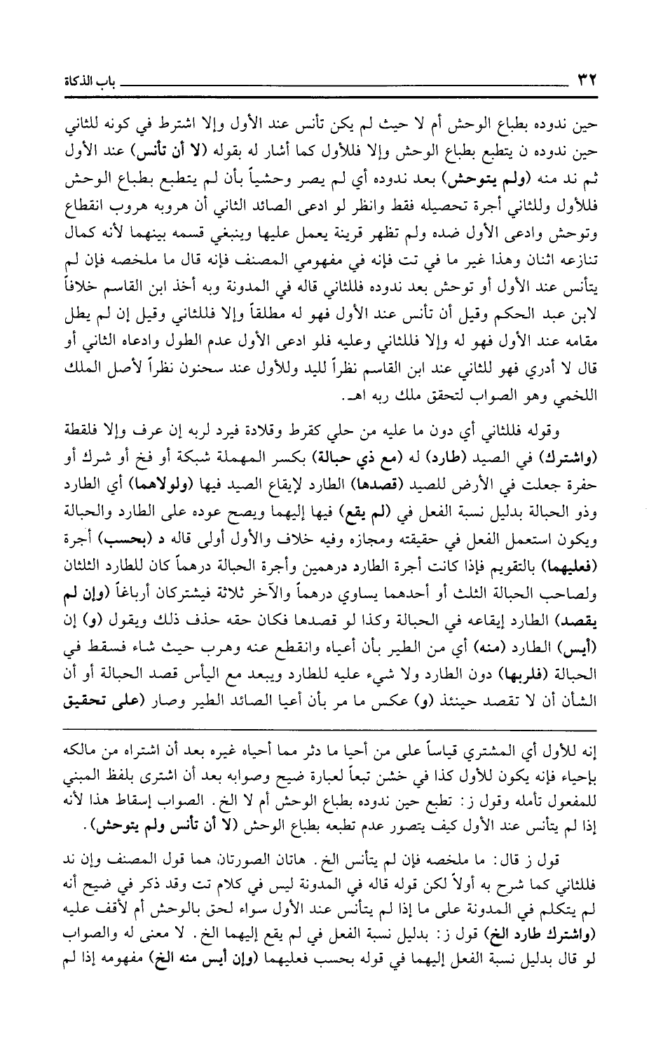قول ز قال: ما ملخصه فإن لم يتأنس الخ. هاتان الصورتان هما قول المصنف وإن ند فللثاني كما شرح به أولًا لكن قوله قاله في المدونة ليس في كلام تت وقد ذكر في ضيح أنه لم يتكلم في المدونة على ما إذا لم يتأنس عند الأول سواء لحق بالوحش أم لأقف عليه (واشترك طارد الخ) قول ز: بدليل نسبة الفعل في لم يقع إليهما الخ. لا معنى له والصواب لو قال بدليل نسبة الفعل إليهما في قوله بحسب فعليهما (وإن أيس منه الخ) مفهومه إذا لم