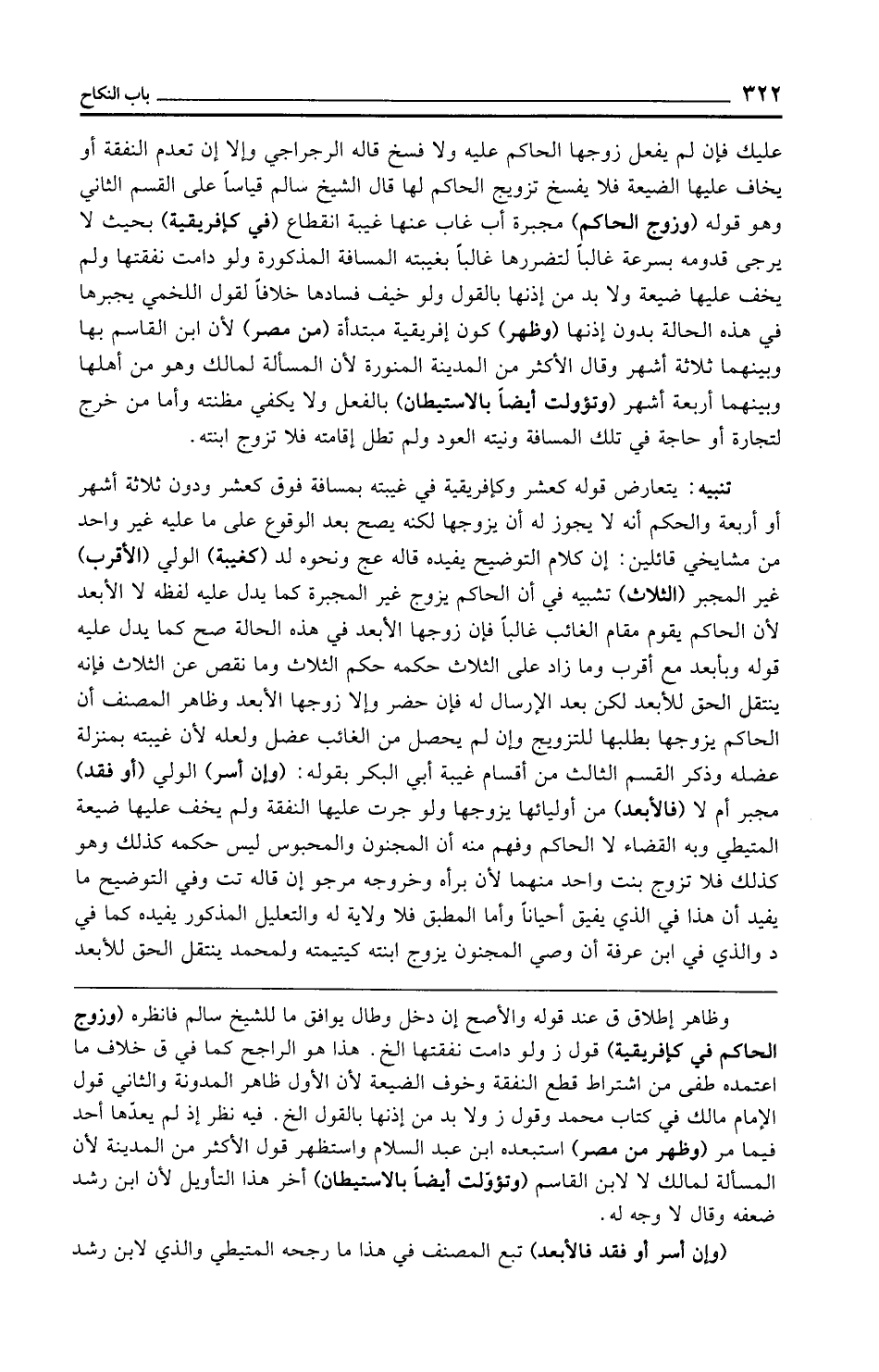 وظاهر إطلاق في عند قوله والأصح إن دخل وطال يوافق ما للشيخ سالم فانظره (وزوج الحاكم في كإفريقية) قول ز ولو دامت نفقتها الخ. هذا هو الراجح كما في ق خلاف ما اعتمده طفى من اشتراط قطع النفقة وخوف الضيعة لأن الأول ظاهر المدونة والثاني قول الإِمام مالك في كتاب محمَّد وقول ز ولا بد من إذنها بالقول الخ. فيه نظر إذ لم يعدّها أحد فيما مر (وظهر من مصر) استبعده ابن عبد السلام واستظهر قول الأكثر من المدينة لأن المسألة لمالك لا لابن القاسم (وتؤوّلت أيضًا بالاستيطان) أخر هذا التأويل لأن ابن رشد ضعفه وقال لا وجه له.