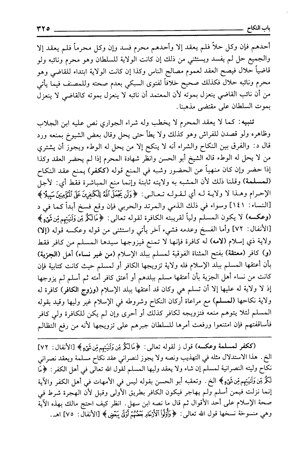 تنبيه: كما لا يعقد المحرم لا يخطب وله شراء الجواري نص عليه ابن الجلاب وظاهره ولو قصدن للفراش وهو كذلك ولا يطأ حتى يحل وقال بعض الشيوخ بمنعه ورد قال د: والفرق بين النكاح والشراء أنه لا ينكح إلا من يحل له الوطء ويجوز أن يشتري من لا يحل له الوطء قاله الشيخ أبو الحسن وانظر شهادة المحرم إذا لم يحضر العقد وكذا إذا حضر وإن كان منهيًّا عن الحضور وشبه في المنع قوله (ككفر) يمنع عقد النكاح (لمسلمة) وقلنا ذلك لأن المشبه به ولايته ثابتة وإنما منع المباشرة فقط أي: لأجل الإحرام وهذا لا ولاية له أي لقوله تعالى: {وَلَنْ يَجْعَلَ اللَّهُ لِلْكَافِرِينَ عَلَى الْمُؤْمِنِينَ سَبِيلًا} [النساء: 141] وسواء في ذلك الذمي والمرتد والحربي فإن وقع فسخ أبدًا كما في د (وعكسه) لا يكون المسلم وليًّا لقريبته الكافرة لقوله تعالى: {مَا لَكُمْ مِنْ وَلَايَتِهِمْ مِنْ شَيْءٍ} [الأنفال: 72] وأما الفسخ وعدمه فشيء آخر يأتي واستثنى من قوله وعكسه قوله (إلا) ولاية ذي إسلام (لامه) له كافرة فإنها لا تمنع فيزوجها سيدها المسلم من كافر فقط (و) كافر (معتقة) بفتح المثناة الفوقية لمسلم ببلد الإسلام (من غير نساء) أهل (الجزية) بأن أعتقها المسلم ببلد الإسلام فله ولاية تزويجها الكافر أو لمسلم حيث كانت كتابية فإن كانت من نساء أهل الجزية بأن أعتقها مسلم ببلدهم أو أعتق كافر أمته ثم أسلم لم يزوجها إذ لا ولاية له عليها إلا أن تسلم هي وكان قد أعتقها ببلد الإسلام (وزوج الكافر) كافرة له ولاية نكاحها (لمسلم) مع مراعاة أركان النكاح وشروطه في الإسلام غير وليها وقيد بقوله المسلم لئلا يتوهم منعه فتزويجه لكافر كذلك أو أحرى وإن لم يكن للكافرة ولي كافر فأساقفتهم فإن امتنعوا ورفعت أمرها للسلطان جبرهم على تزويجها لأنه من رفع التظالم