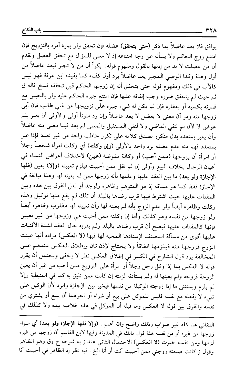 يوافق فلا يعد عاضلًا بما ذكر (حتى يتحقق) عضله فإن تحقق ولو بمرة أمره بالتزويج فإن امتنع زوج الحاكم ولا يسأله عن وجه امتناعه إذ لا معنى للسؤال مع تحقق العضل وتقدم أن من عضلت لا بد من إذنها بالقول ومفهوم قوله: بكرًا أن من لا تجبر فيعد عاضلًا من أول وهلة وكذا الوصي المجبر يعد عاضلًا برد أول كفء كما يفيده ابن عرفة فهو ليم كالأب في ذلك ومفهوم قوله حتى يتحقق أنه إن زوجها الحاكم قبل تحققه فسخ قاله ق ثم حيث لم يتحقق ضرره وجب إنفاقه عليها فإن امتنع جبره الحاكم عليه ولو بالحبس مع قدرته بكسبه أو بعقاره فإن لم يكن له شيء جبره على تزويجها من غني طالب فإن أبى زوجها منه ومر أن معنى لا يعضل لا يعد عاضلًا وإن رد منونًا أولى والأولى أن يعبر بلم عوض لا لأن لم لنفي الماضي ولا لنفي المستقبل والمعنى لم يعد فيما مضى منه عاضلًا وأن يعبر بمتعدد بدل متكرر لصدق كلامه على تكرر خاطب واحد من غير تعدد فإذا عبر بمتعدد فهم منه عدم عضله برد واحد بالأولى (وإن وكلته) أي وكلت امرأة شخصًا رجلًا أو امرأة أن يزوجها (ممن أحب) أو وكالة مفوضة (عين) لاختلاف أغراض النساء في أعيان الرجال بخلاف البيع وأولى إن لم تقل ممن أحببت فيلزم تعيينه (وإلا) يعين (فلها الإجازة ولو بعد) ما بين العقد عليها وعلمها بأنه زوجها ممن لم يعينه لها وهذا مبالغة في الإجازة فقط كما هو مساقه إذ هو المتوهم وظاهره ولوجد أو لعل الفرق بين هذه وبين المفتات عليها حيث اشترط فيها قرب رضاها بالبلد أن تلك لم يقع منها توكيل وهذه وكلت وظاهره أيضًا ولو علم الزوج بأنه لم يعينه لها وأن تعيينه لها مطلوب وظاهره أيضًا ولو زوجها من نفسه وهو كذلك وأما إن وكلته ممن أحبت هي وزوجها من غير تعيين فإنها كالمفتات عليها فيصح أن قرب رضاها بالبلد ولم يقربه حال العقد لشدة الأفتيات عليها أقوى من مسألة المصنف لإسنادها المحبة لها فيها (لا العكس) مراده أنها عينت الزوج فزوجها منه فيلزمها اتفاقًا ولا يحتاج لإذن ثان وإطلاق العكس عندهم على المخالفة يرد قول الشارح في الكبير في إطلاق العكس نظر لا يخفى ويحتمل أن يقرر قوله لا العكس بما إذا وكل رجل رجلًا أو امرأة على التزويج ممن أحب من غير أن يعين الزوجة فزوجه ولم يعينها له ولم يستأذنه لزمته إن كانت ممن تليق به كما في المتيطية وإلا لم يلزم ويستثنى ما إذا زوجته الوكيلة من نفسها فيخير بين الإجازة والرد لأن الوكيل على شيء لا يفعله مع نفسه فليس للموكل على بيع أو شراء أو نحوهما أن يبيع أو يشتري من نفسه والفرق بين قوله لا العكس وما قبله أن الموكل في هذه خلاصه بيده ولا كذلك في