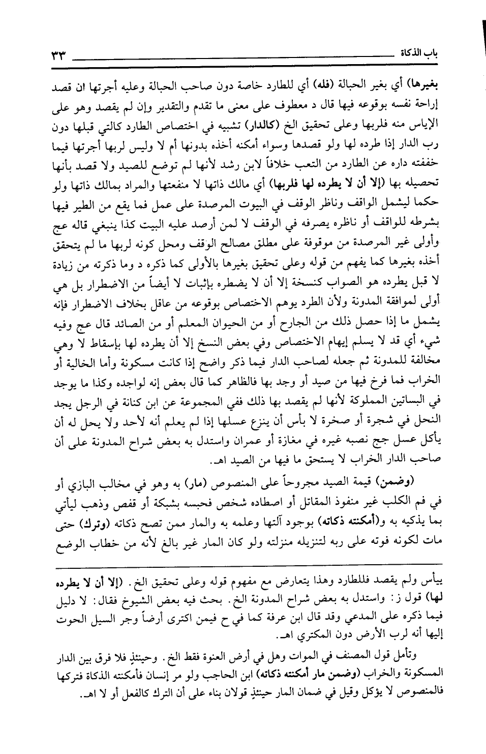 وتأمل قول المصنف في الموات وهل في أرض العنوة فقط الخ. وحينئذٍ فلا فرق بين الدار المسكونة والخراب (وضمن مار أمكنته ذكاته) ابن الحاجب ولو مر إنسان فأمكنته الذكاة فتركها فالمنصوص لا يؤكل وقيل في ضمان المار حينئذ قولان بناء على أن الترك كالفعل أو لا اهـ.