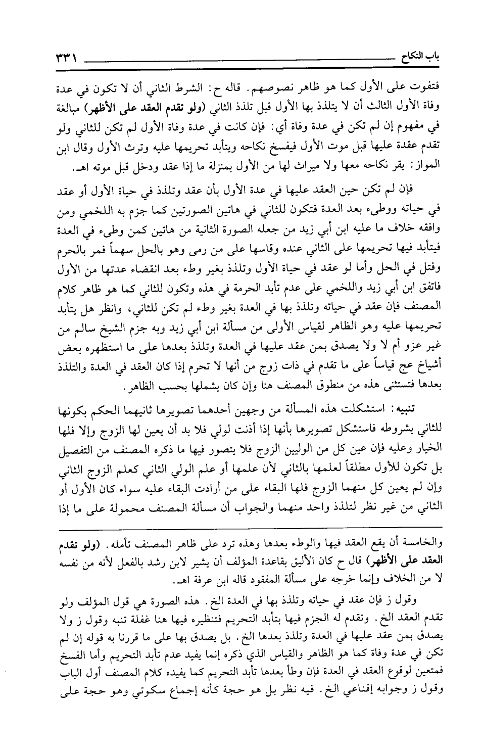 فتفوت على الأول كما هو ظاهر نصوصهم. قاله ح: الشرط الثاني أن لا تكون في عدة وفاة الأول الثالث أن لا يتلذذ بها الأول قبل تلذذ الثاني (ولو تقدم العقد على الأظهر) مبالغة في مفهوم إن لم تكن في عدة وفاة أي: فإن كانت في عدة وفاة الأول لم تكن للثاني ولو تقدم عقدة عليها قبل موت الأول فيفسخ نكاحه ويتأبد تحريمها عليه وترث الأول وقال ابن المواز: يقر نكاحه معها ولا ميراث لها من الأول بمنزلة ما إذا عقد ودخل قبل موته اهـ.