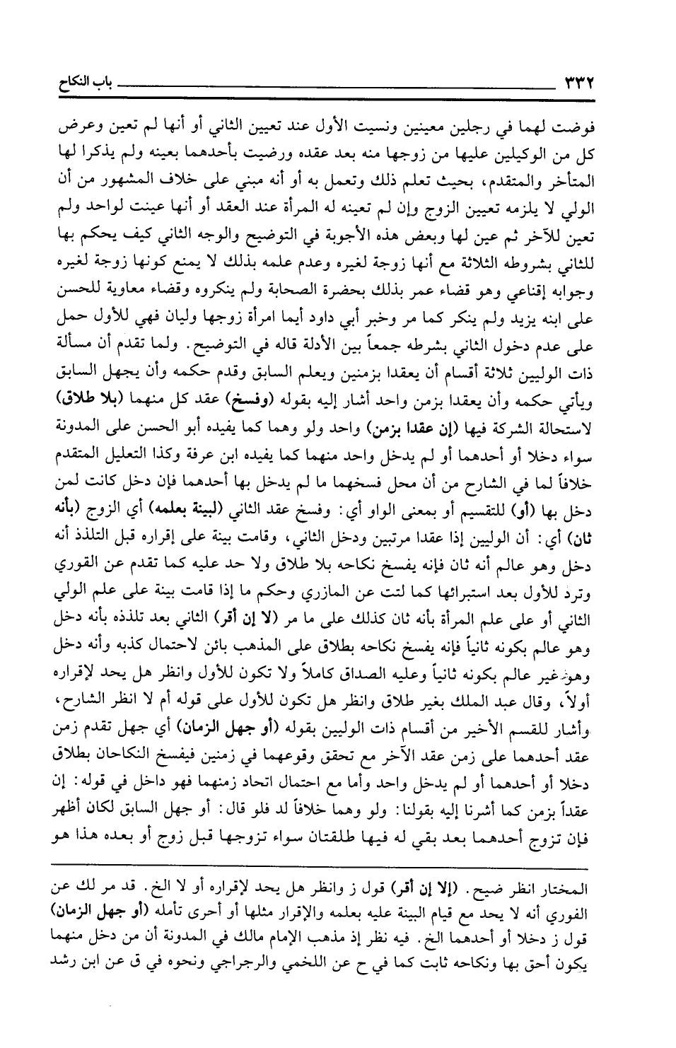 فوضت لهما في رجلين معينين ونسيت الأول عند تعيين الثاني أو أنها لم تعين وعرض كل من الوكيلين عليها من زوجها منه بعد عقده ورضيت بأحدهما بعينه ولم يذكرا لها المتأخر والمتقدم، بحيث تعلم ذلك وتعمل به أو أنه مبني على خلاف المشهور من أن الولي لا يلزمه تعيين الزوج وإن لم تعينه له المرأة عند العقد أو أنها عينت لواحد ولم تعين للآخر ثم عين لها وبعض هذه الأجوبة في التوضيح والوجه الثاني كيف يحكم بها للثاني بشروطه الثلاثة مع أنها زوجة لغيره وعدم علمه بذلك لا يمنع كونها زوجة لغيره وجوابه إقناعي وهو قضاء عمر بذلك بحضرة الصحابة ولم ينكروه وقضاء معاوية للحسن على ابنه يزيد ولم ينكر كما مر وخبر أبي داود أيما امرأة زوجها وليان فهي للأول حمل على عدم دخول الثاني بشرطه جمعًا بين الأدلة قاله في التوضيح. ولما تقدم أن مسألة ذات الوليين ثلاثة أقسام أن يعقدا بزمنين ويعلم السابق وقدم حكمه وأن يجهل السابق ويأتي حكمه وأن يعقدا بزمن واحد أشار إليه بقوله (وفسخ) عقد كل منهما (بلا طلاق) لاستحالة الشركة فيها (إن عقدا بزمن) واحد ولو وهما كما يفيده أبو الحسن على المدونة سواء دخلا أو أحدهما أو لم يدخل واحد منهما كما يفيده ابن عرفة وكذا التعليل المتقدم خلافًا لما في الشارح من أن محل فسخهما ما لم يدخل بها أحدهما فإن دخل كانت لمن دخل بها (أو) للتقسيم أو بمعنى الواو أي: وفسخ عقد الثاني (لبينة بعلمه) أي الزوج (بأنه ثان) أي: أن الوليين إذا عقدا مرتبين ودخل الثاني، وقامت بينة على إقراره قبل التلذذ أنه دخل وهو عالم أنه ثان فإنه يفسخ نكاحه بلا طلاق ولا حد عليه كما تقدم عن القوري وترد للأول بعد استبرائها كما لتت عن المازري وحكم ما إذا قامت بينة على علم الولي الثاني أو على علم المرأة بأنه ثان كذلك على ما مر (لا إن أقر) الثاني بعد تلذذه بأنه دخل وهو عالم بكونه ثانيًا فإنه يفسخ نكاحه بطلاق على المذهب بائن لاحتمال كذبه وأنه دخل وهو غير عالم بكونه ثانيًا وعليه الصداق كاملًا ولا تكون للأول وانظر هل يحد لإقراره أولًا، وقال عبد الملك بغير طلاق وانظر هل تكون للأول على قوله أم لا انظر الشارح، وأشار للقسم الأخير من أقسام ذات الوليين بقوله (أو جهل الزمان) أي جهل تقدم زمن عقد أحدهما على زمن عقد الآخر مع تحقق وقوعهما في زمنين فيفسخ النكاحان بطلاق دخلا أو أحدهما أو لم يدخل واحد وأما مع احتمال اتحاد زمنهما فهو داخل في قوله: إن عقدًا بزمن كما أشرنا إليه بقولنا: ولو وهما خلافًا لد فلو قال: أو جهل السابق لكان أظهر فإن تزوج أحدهما بعد بقي له فيها طلقتان سواء تزوجها قبل زوج أو بعده هذا هو