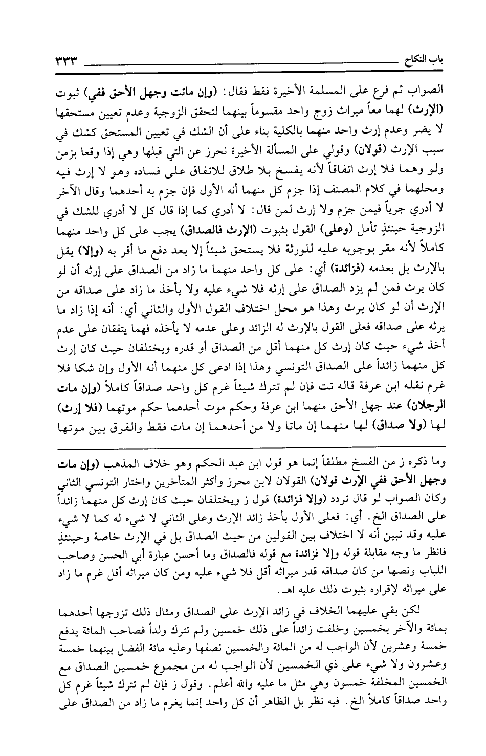 الصواب ثم فرع على المسلمة الأخيرة فقط فقال: (وإن ماتت وجهل الأحق ففي) ثبوت (الإرث) لهما معًا ميراث زوج واحد مقسومًا بينهما لتحقق الزوجية وعدم تعيين مستحقها لا يضر وعدم إرث واحد منهما بالكلية بناء على أن الشك في تعيين المستحق كشك في سبب الإرث (قولان) وقولي على المسألة الأخيرة نحرز عن التي قبلها وهي إذا وقعا بزمن ولو وهما فلا إرث اتفاقًا لأنه يفسخ بلا طلاق للاتفاق على فساده وهو لا إرث فيه ومحلهما في كلام المصنف إذا جزم كل منهما أنه الأول فإن جزم به أحدهما وقال الآخر لا أدري جريًا فيمن جزم ولا إرث لمن قال: لا أدري كما إذا قال كل لا أدري للشك في الزوجية حينئذٍ تأمل (وعلى) القول بثبوت (الإرث فالصداق) يجب على كل واحد منهما كاملًا لأنه مقر بوجوبه عليه للورثة فلا يستحق شيئًا إلا بعد دفع ما أقر به (وإلا) يقل بالإرث بل بعدمه (فزائدة) أي: على كل واحد منهما ما زاد من الصداق على إرثه أن لو كان يرث فمن لم يزد الصداق على إرثه فلا شيء عليه ولا يأخذ ما زاد على صداقه من الإرث أن لو كان يرث وهذا هو محل اختلاف القول الأول والثاني أي: أنه إذا زاد ما يرثه على صداقه فعلى القول بالإرث له الزائد وعلى عدمه لا يأخذه فهما يتفقان على عدم أخذ شيء حيث كان إرث كل منهما أقل من الصداق أو قدره ويختلفان حيث كان إرث كل منهما زائدًا على الصداق التونسي وهذا إذا ادعى كل منهما أنه الأول وإن شكا فلا غرم نقله ابن عرفة قاله تت فإن لم تترك شيئًا غرم كل واحد صداقًا كاملًا (وإن مات الرجلان) عند جهل الأحق منهما ابن عرفة وحكم موت أحدهما حكم موتهما (فلا إرث) لها (ولا صداق) لها منهما إن ماتا ولا من أحدهما إن مات فقط والفرق بين موتها