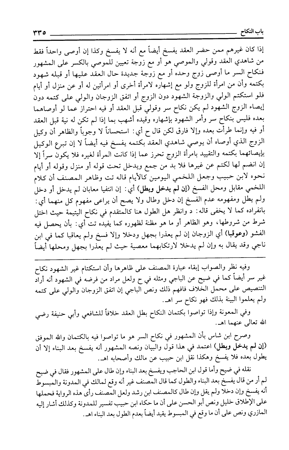 نقله في ضيح وأما قول ابن الحاجب ويفسخ بعد البناء وإن طال على المشهور فقال في ضيح لم أر من قال يفسخ بعد البناء والطول كما قال المصنف غير أنه وقع لمالك في المدونة والمبسوط أنه يفسخ وإن دخلا ولم يقل وإن طال كالمصنف ابن رشد ولعل المصنف رأى هذه الرواية فحملها على الإطلاق خليل ونص أبو الحسن على أن ما حكاه ابن حبيب تفسير للمدونة وكذلك أشار إليه المازري ونص على أن ما وقع في المبسوط يقيد أيضًا بعدم الطول بعد البناء اهـ.