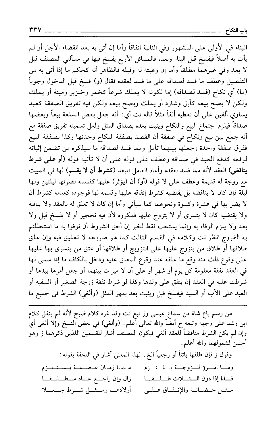 البناء في الأولى على المشهور وفي الثانية اتفاقًا وأما إن أتى به بعد انقضاء الأجل أو لم يأت به أصلًا فيفسخ قبل البناء وبعده فالمسائل الأربع يفسخ فيها في مسألتي المصنف قبل لا بعد وفي غيرهما مطلقًا وأما إن وهبته له وقبله فالظاهر أنه كحكم ما إذا أتى به من التفصيل وعطف ما فسد لصداقه على ما فسد لعقده فقال (و) فسخ قبل الدخول وجوبًا (ما) أي نكاح (فسد لصداقه) إما لكونه لا يملك شرعًا كخمر وخنزير وميتة أو يملك ولكن لا يصح بيعه كآبق وشارد أو يملك ويصح بيعه ولكن فيه تفريق الصفقة كعبد يساوي ألفين على أن تعطيه ألفًا مثلًا قاله تت أي: أنه جعل بعض السلعة بيعًا وبعضها صداقًا فيلزم اجتماع البيع والنكاح ويثبت بعده بصداق المثل ولعل تسميته تفريق صفقة مع أنه جمع بين بيع ونكاح في صفقة أن القصد بصفقة النكاح وحدتها وكذا بصفقة البيع ففرق صفقة واحدة وجعلها بينهما تأمل ومما فسد لصداقه ما سيذكره من تضمن إثباته لرفعه كدفع العبد في صداقه وعطف على قوله على أن لا تأتيه قوله (أو على شرط يناقض) العقد لأنه مما فسد لعقده وأعاد العامل للبعد (كشرط أن لا يقسم) لها في المبيت مع زوجة له قديمة وعطف على لا قوله (أو) أن (يؤثر) عليها كقسمه لضرتها ليلتين ولها ليلة فإن كان لا يناقضه بل يقتضيه كشرط إنفاقه عليها وقسمه لها فوجوده كعدمه كشرط أن لا يضر بها في عشرة وكسوة ونحوهما كما سيأتي وأما إن كان لا تعلق له بالعقد ولا ينافيه ولا يقتضيه كان لا يتسرى أو لا يتزوج عليها فمكروه لأن فيه تحجير أو لا يفسخ قبل ولا بعد ولا يلزم الوفاء به وإنما يستحب فقط لخبر إن أحق الشروط أن توفوا به ما استحللتم به الفروج انظر تت وكلامه في القسم الثالث كما هو صريحه لا تعليق فيه وإن علق طلاقها أو طلاق من يتزوج عليها على التزويج أو طلاقها أو عتق من يتسرى بها عليها على وقوع ذلك منه وقع ما علقه عند وقوع المعلق عليه ودخل بالكاف ما إذا سمى لها في العقد نفقة معلومة كل يوم أو شهر أو على أن لا ميراث بينهما أو جعل أمرها بيدها أو شرطت عليه في العقد إن ينفق على ولدها وكذا لو شرط نفقة زوجة الصغير أو السفيه أو العبد على الأب أو السيد فيفسخ قبل ويثبت بعد بمهر المثل (وألغي) الشرط في جميع ما