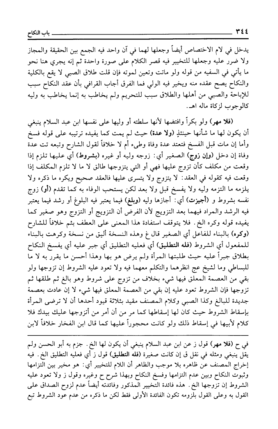 يدخل في لام الاختصاص أيضًا وجعلها لهما في آن واحد فيه الجمع بين الحقيقة والمجاز ولا ضرر عليه وجعلها للتخيير فيه قصر الكلام على صورة واحدة ثم إنه يجري هنا نحو ما يأتي في السفيه من قوله ولو ماتت وتعين لموته فإن قلت طلاق الصبي لا يقع بالكلية والنكاح يصح عقده منه ويخير فيه الولي فما الفرق أجاب القرافي بأن عقد النكاح سبب للإباحة والصبي من أهلها والطلاق سبب للتحريم ولم يخاطب به إنما يخاطب به وليّه كالوجوب لزكاة ماله اهـ.