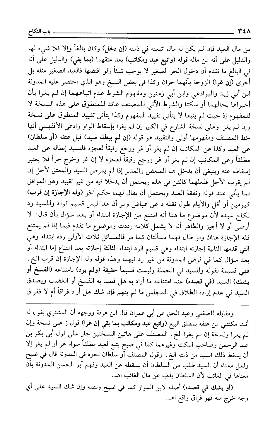 ومقابله للصقلي وعبد الحق عن أبي عمران قال ابن عرفة ووجهه أن المشتري يقول له أنت مكنتني من عتقه بمطلق البيع (واتبع عبد ومكاتب بما بقي إن غرا) قول ز على نسخة وإن لم يغرا ونسخة إن لم يغرا الخ. المصنف على هاتين النسختين جار على قول أبي بكر بن عبد الرحمن وصاحب النكت وغيرهما كما في ضيح يتبع لعبد مطلقًا سواء غر أو لم يغر إلا أن يسقط ذلك السيد من ذمته الخ. وقول المصنف أو سلطان نحوه في المدونة قال في ضيح ولعل معناه أن السيد طلب من السلطان أن يسقطه عن العبد وفهم أبو الحسن المدونة بأن معناها في الغائب لأن السلطان يذب عن مال الغائب اهـ.