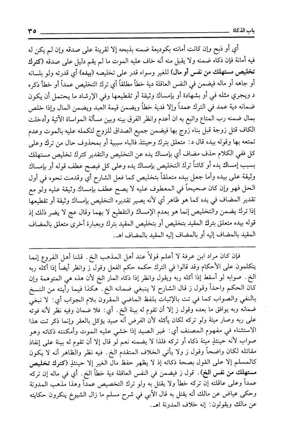 فإن كان مراد ابن عرفة لا أعلم قولًا عند أهل المذهب الخ. قلنا أهل الفروع إنما يتكلمون على الأحكام وقد قالوا في الترك حكمه حكم الفعل وقول ز وانظر أيضًا إذا أكله ربه الخ. صوابه لو أسقط إذا أكله ربه ويقول وانظر إذا ذكاه المار الخ لأن هذه هي المتوهمة وإن كان الحكم واحدًا وقول ز قال الشارح لا ينبغي ضمانه الخ. هكذا فيما رأيته من النسخ بالنفي والصواب كما في تت بالإثبات بلفظ الماضي المقرون بلام الجواب أي: لا نبغي ضمانه وبه يوافق ما بعده وقول ز إلا أن تقوم له بينة الخ. أي: فلا ضمان وفيه نظر لأنه فوته على ربه وصار ميتة ولو تركه لكان يأكله لأن الفرض أنه صيد يؤكل بالعقر وإنما ذكر تت هذا الاستثناء في مفهوم المصنف أي: غير الصيد إذا خشي عليه الموت وأمكنته ذكاته وهو صواب لأنه حينئذ ميتة ذكاه أو تركه فلذا لا يضمنه نعم لو قال إلا أن تقوم له بينة على إنفاذ مقاتله لكان واضحًا وقول ز ولا يأتي الخلاف المتقدم الخ. فيه نظر والظاهر أنه لا يكون كالمسلم إلا على القول بصحة ذكاته إذ لا يظهر حفظ مال الغير إلا حينئذٍ (كترك تخليص مستهلك من نفس الخ). قول ز فيضمن في النفس العاقلة دية خطأ الخ. أي في ماله إن تركه عمدًا وعلى عاقلته إن تركه خطأ ولا يقتل به ولو ترك التخصيص عمدًا وهذا مذهب المدونة وحكى عياض عن مالك أنه يقتل به قال الآبي في شرح مسلم ما زال الشيوخ ينكرون حكايته عن مالك ويقولون: إنه خلاف المدونة اهـ.