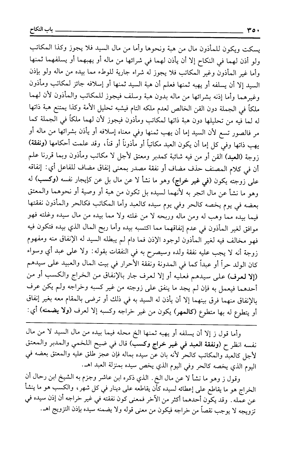 وقول ز وهو ما نشأ لا عن مال الخ. الذي ذكره ابن عاشر وجزم به الشيخ ابن رحال أن الخراج هو ما يقاطع على إعطائه لسيده كأن يقاطعه على دينار في كل شهر، والكسب هو ما ينشأ عن عمله. وقد يكون أحدهما أكثر من الآخر فمعنى كون نفقته في غير خراجه أن إذن سيده في تزويجه لا يوجب نقصًا من خراجه فيكون من معنى قوله ولا يضمنه سيده بإذن التزويج اهـ.