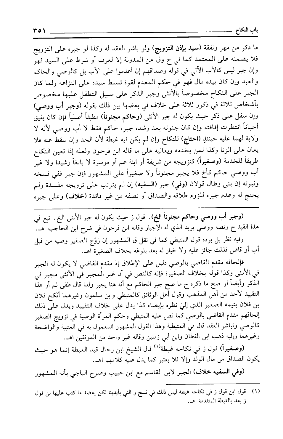 (وجبر أب ووصي وحاكم مجنونًا الخ). قول ز حيث يكون له جبر الأنثى الخ. تبع في هذا القيد ح ونصه ووصي يريد الذي له الإجبار وقاله ابن فرحون في شرح ابن الحاجب اهـ.