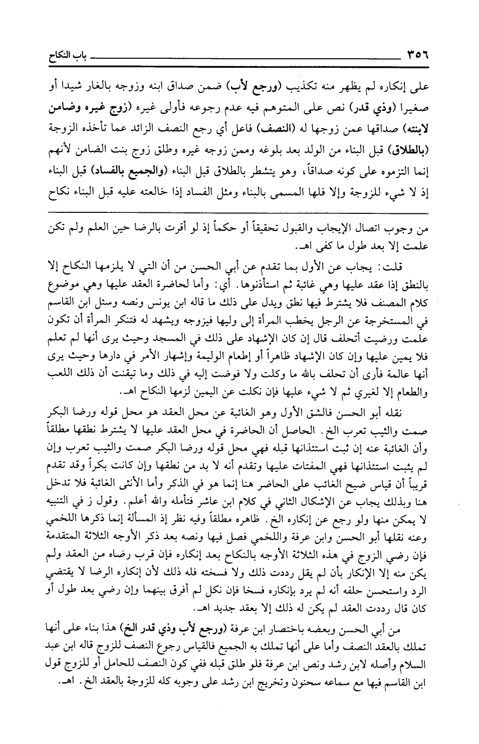 نقله أبو الحسن فالشق الأول وهو الغائبة عن محل العقد هو محل قوله ورضا البكر صمت والثيب تعرب الخ. الحاصل أن الحاضرة في محل العقد عليها لا يشترط نطقها مطلقًا وأن الغائبة عنه إن ثبت استئذانها قبله فهي محل قوله ورضا البكر صمت والثيب تعرب وإن لم يثبت استئذانها فهي المفتات عليها وتقدم أنه لا بد من نطقها وإن كانت بكرًا وقد تقدم قريبًا أن قياس ضيح الغائب على الحاضر هنا إنما هو في الذكر وأما الأنثى الغائبة فلا تدخل هنا وبذلك يجاب عن الإشكال الثاني في كلام ابن عاشر فتأمله والله أعلم. وقول ز في التنبيه لا يمكن منها ولو رجع عن إنكاره الخ. ظاهره مطلقًا وفيه نظر إذ المسألة إنما ذكرها اللخمي وعنه نقلها أبو الحسن وابن عرفة واللخمي فصل فيها ونصه بعد ذكر الأوجه الثلاثة المتقدمة فإن رضي الزوج في هذه الثلاثة الأوجه بالنكاح بعد إنكاره فإن قرب رضاه من العقد ولم يكن منه إلا الإنكار بأن لم يقل رددت ذلك ولا فسخته فله ذلك لأن إنكاره الرضا لا يقتضي الرد واستحسن حلفه أنه لم يرد بإنكاره فسخا فإن نكل لم أفرق بينهما وإن رضي بعد طول أو كان قال رددت العقد لم يكن له ذلك إلا بعقد جديد اهـ.