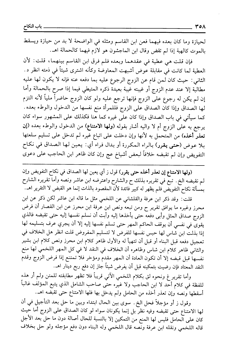 قلت: وقد ذكر ابن عرفة والقلشاني عن اللخمي مثل ما قاله ابن عاشر لكن ذكر عن ابن محرز وغيره ما يوافق تقرير ح ومن تبعه ونص ابن عرفة ابن محرز عن ابن القصار أن فرض الزوج صداق المثل وأبى دفعه حتى يأخذها إليه وأبت أن نسلم نفسها إليه حتى تقبضه فالذي يقوى في نفسي أن يوقف الحاكم المهر حتى تسلم نفسها إليه إلا أن يجري عرف بتسليمه لها إذا بذلت ابن شاس لها حبس نفسها للفرض لا لتسليم المفروض قلت انظر هل الخلاف في تعجيل دفعه قبل البناء أو قبل أن تتهيأ له والأول ظاهر كلام ابن محرز ونص كلام ابن بشير والثاني ظاهر كلام ابن شاس وظاهره أن الخلاف في النقد لا في كل المهر اللخمي لها منع نفسها قبل قبضه إلا أن تكون العادة أن المهر مقدم ومؤخر فلا تمتنع إذا فرض الزوج وقدم النقد المعتاد فإن رضيت بتمكينه قبل أن يفرض شيئًا جاز إن دفع ربع دينار اهـ.