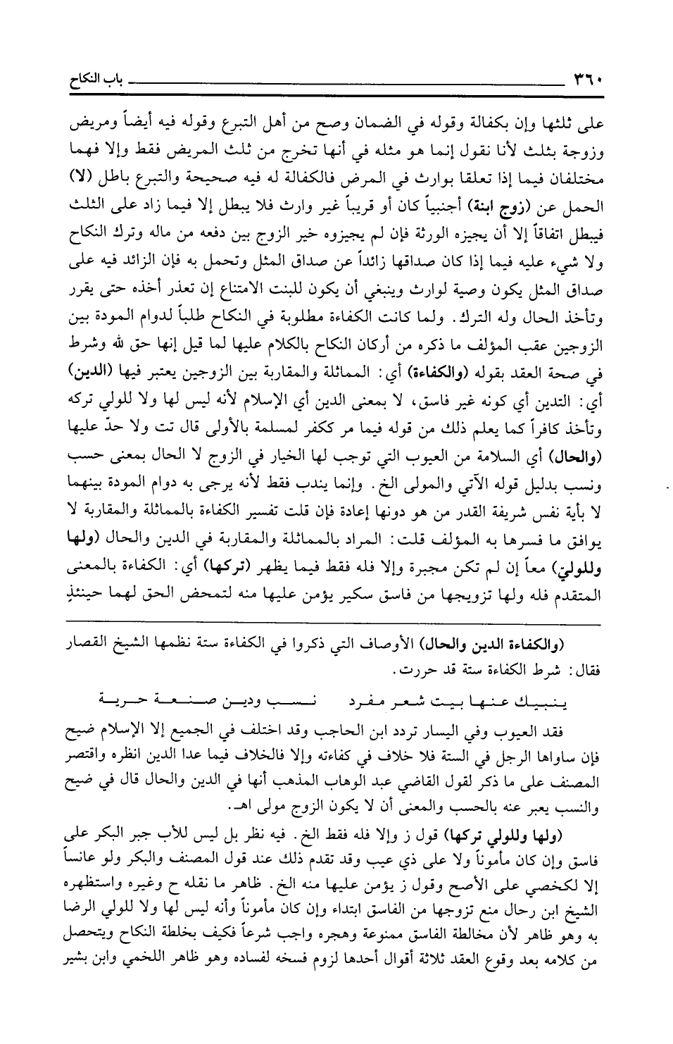 على ثلثها وإن بكفالة وقوله في الضمان وصح من أهل التبرع وقوله فيه أيضًا ومريض وزوجة بثلث لأنا نقول إنما هو مثله في أنها تخرج من ثلث المريض فقط وإلا فهما مختلفان فيما إذا تعلقا بوارث في المرض فالكفالة له فيه صحيحة والتبرع باطل (لا) الحمل عن (زوج ابنة) أجنبيًّا كان أو قريبًا غير وارث فلا يبطل إلا فيما زاد على الثلث فيبطل اتفاقًا إلا أن يجيزه الورثة فإن لم يجيزوه خير الزوج بين دفعه من ماله وترك النكاح ولا شيء عليه فيما إذا كان صداقها زائدًا عن صداق المثل وتحمل به فإن الزائد فيه على صداق المثل يكون وصية لوارث وينبغي أن يكون للبنت الامتناع إن تعذر أخذه حتى يقرر وتأخذ الحال وله الترك. ولما كانت الكفاءة مطلوبة في النكاح طلبًا لدوام المودة بين الزوجين عقب المؤلف ما ذكره من أركان النكاح بالكلام عليها لما قيل إنها حق لله وشرط في صحة العقد بقوله (والكفاءة) أي: المماثلة والمقاربة بين الزوجين يعتبر فيها (الدين) أي: التدين أي كونه غير فاسق، لا بمعنى الدين أي الإسلام لأنه ليس لها ولا للولي تركه وتأخذ كافرًا كما يعلم ذلك من قوله فيما مر ككفر لمسلمة بالأولى قال تت ولا حدّ عليها (والحال) أي السلامة من العيوب التي توجب لها الخيار في الزوج لا الحال بمعنى حسب ونسب بدليل قوله الآتي والمولى الخ. وإنما يندب فقط لأنه يرجى به دوام المودة بينهما لا بأية نفس شريفة القدر من هو دونها إعادة فإن قلت تفسير الكفاءة بالمماثلة والمقاربة لا يوافق ما فسرها به المؤلف قلت: المراد بالمماثلة والمقاربة في الدين والحال (ولها وللوليّ) معًا إن لم تكن مجبرة وإلا فله فقط فيما يظهر (تركها) أي: الكفاءة بالمعنى المتقدم فله ولها تزويجها من فاسق سكير يؤمن عليها منه لتمحض الحق لهما حينئذٍ