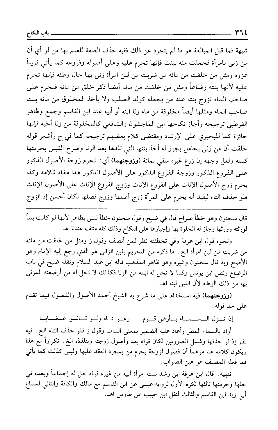 شبهة فما قبل المبالغة هو ما لم يتجرد عن ذلك ففيه حذف الصفة للعلم بها من لو أي أن من زنى بامرأة فحملت منه ببنت فإنها تحرم عليه وعلى أصوله وفروعه كما يأتي قريبًا عزوه ومثل من خلقت من مائه من شربت من لبن امرأة زنى بها حال وطئه فإنها تحرم عليه لأنها بنته رضاعًا ومثل من خلقت من مائه أيضًا ذكر خلق من مائه فيحرم على صاحب الماء تزوج بنته عند من يجعله كولد الصلب ولا يأخذ المخلوق من مائه بنت صاحب الماء ومثلها أيضًا مخلوقة من ماء زنا ابنه أو أبيه عند ابن القاسم وجمع وظاهر القرطبي ترجيحه وأجاز نكاحها ابن الماجشون والشافعي كالمخلوقة من زنا أخيه فإنها جائزة كما للبحيري على الإرشاد ومقتضى كلام بعضهم ترجيحه كما في ح وأشعر قوله خلقت أن من زنى بحامل يجوز له أخذ بنتها التي تلدها بعد الزنا وصرح القبس بحرمتها كبنته ولعل وجهه إن زرع غيره سقي بمائه (وزوجتهما) أي: تحرم زوجة الأصول الذكور على الفروع الذكور وزوجة الفروع الذكور على الأصول المذكور هذا مفاد كلامه وكذا يحرم زوج الأصول الإناث على الفروع الإناث وزوج الفروع الإناث على الأصول الإناث فلو حذف التاء ليفيد أنه يحرم على المرأة زوج أصلها وزوج فصلها لكان أحسن إذ الزوج