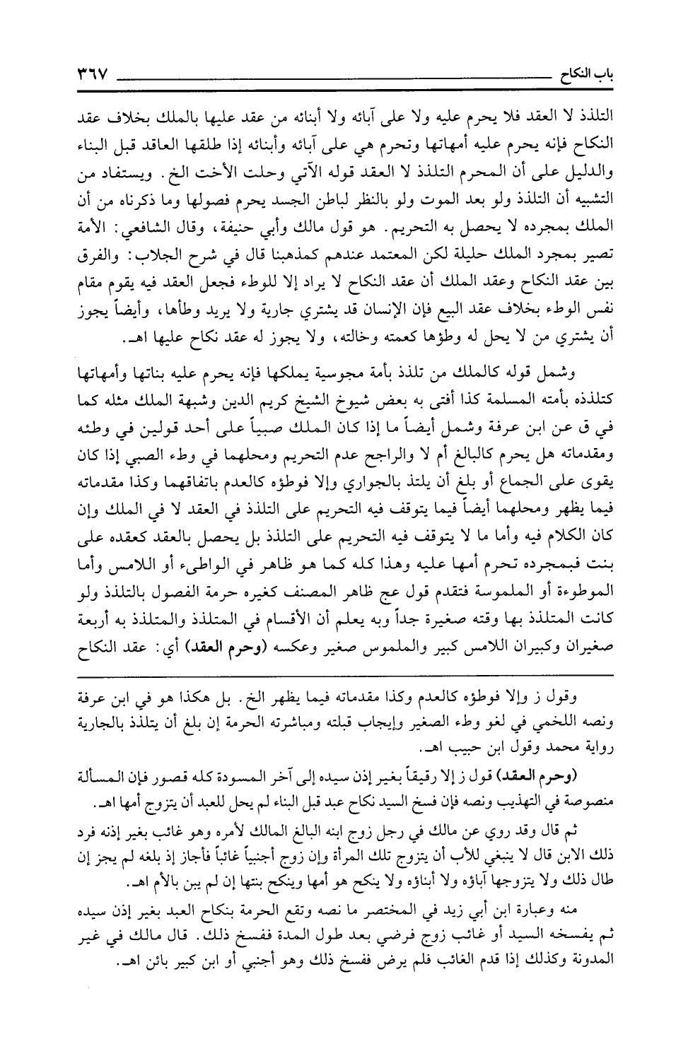 التلذذ لا العقد فلا يحرم عليه ولا على آبائه ولا أبنائه من عقد عليها بالملك بخلاف عقد النكاح فإنه يحرم عليه أمهاتها وتحرم هي على آبائه وأبنائه إذا طلقها العاقد قبل البناء والدليل على أن المحرم التلذذ لا العقد قوله الآتي وحلت الأخت الخ. ويستفاد من التشبيه أن التلذذ ولو بعد الموت ولو بالنظر لباطن الجسد يحرم فصولها وما ذكرناه من أن الملك بمجرده لا يحصل به التحريم. هو قول مالك وأبي حنيفة، وقال الشافعي: الأمة تفسير بمجرد الملك حليلة لكن المعتمد عندهم كمذهبنا قال في شرح الجلاب: والفرق بين عقد النكاح وعقد الملك أن عقد النكاح لا يراد إلا للوطء فجعل العقد فيه يقوم مقام نفس الوطء بخلاف عقد البيع فإن الإنسان قد يشتري جارية ولا يريد وطأها، وأيضًا يجوز أن يشتري من لا يحل له وطؤها كعمته وخالته، ولا يجوز له عقد نكاح عليها اهـ.