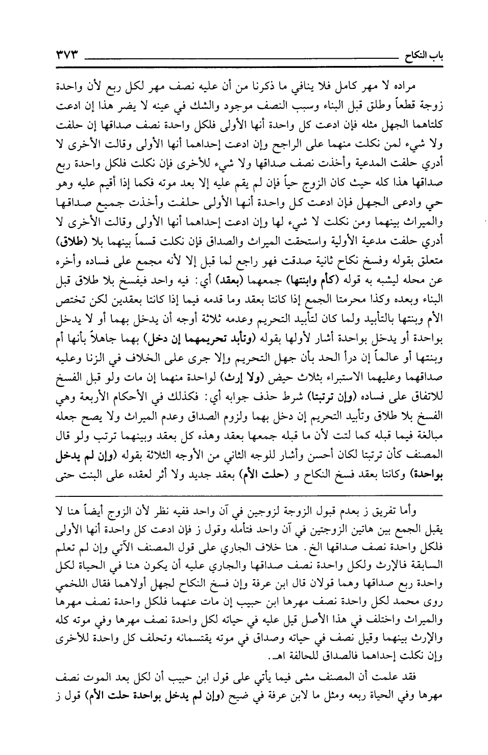 مراده لا مهر كامل فلا ينافي ما ذكرنا من أن عليه نصف مهر لكل ربع لأن واحدة زوجة قطعًا وطلق قبل البناء وسبب النصف موجود والشك في عينه لا يضر هذا إن ادعت كلتاهما الجهل مثله فإن ادعت كل واحدة أنها الأولى فلكل واحدة نصف صداقها إن حلفت ولا شيء لمن نكلت منهما على الراجح وإن ادعت إحداهما أنها الأولى وقالت الأخرى لا أدري حلفت المدعية وأخذت نصف صداقها ولا شيء للأخرى فإن نكلت فلكل واحدة ربع صداقها هذا كله حيث كان الزوج حيًّا فإن لم يقم عليه إلا بعد موته فكما إذا أقيم عليه وهو حي وادعى الجهل فإن ادعت كل واحدة أنها الأولى حلفت وأخذت جميع صداقها والميراث بينهما ومن نكلت لا شيء لها وإن ادعت إحداهما أنها الأولى وقالت الأخرى لا أدري حلفت مدعية الأولية واستحقت الميراث والصداق فإن نكلت قسمًا بينهما بلا (طلاق) متعلق بقوله وفسخ نكاح ثانية صدقت فهو راجع لما قبل إلا لأنه مجمع على فساده وأخره عن محله ليشبه به قوله (كأم وابنتها) جمعهما (بعقد) أي: فيه واحد فيفسخ بلا طلاق قبل البناء وبعده وكذا محرمتا الجمع إذا كانتا بعقد وما قدمه فيما إذا كانتا بعقدين لكن تختص الأم وبنتها بالتأبيد ولما كان لتأبيد التحريم وعدمه ثلاثة أوجه أن يدخل بهما أو لا يدخل بواحدة أو يدخل بواحدة أشار لأولها بقوله (وتأبد تحريمهما إن دخل) بهما جاهلًا بأنها أم وبنتها أو عالمًا إن درأ الحد بأن جهل التحريم وإلا جرى على الخلاف في الزنا وعليه صداقهما وعليهما الاستبراء بثلاث حيض (ولا إرث) لواحدة منهما إن مات ولو قبل الفسخ للاتفاق على فساده (وإن ترتبتا) شرط حذف جوابه أي: فكذلك في الأحكام الأربعة وهي الفسخ بلا طلاق وتأبيد التحريم إن دخل بهما ولزوم الصداق وعدم الميراث ولا يصح جعله مبالغة فيما قبله كما لتت لأن ما قبله جمعها بعقد وهذه كل بعقد وبينهما ترتب ولو قال المصنف كأن ترتبتا لكان أحسن وأشار للوجه الثاني من الأوجه الثلاثة بقوله (وإن لم يدخل بواحدة) وكانتا بعقد فسخ النكاح و (حلت الأم) بعقد جديد ولا أثر لعقده على البنت حتى