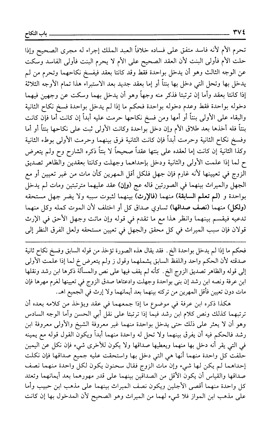 تحرم الأم لأنه فاسد متفق على فساده خلافًا العبد الملك إجراء له مجرى الصحيح وإذا حلت الأم فأولى البنت لأن العقد الصحيح على الأم لا يحرم البنت فأولى الفاسد وسكت عن الوجه الثالث وهو أن يدخل بواحدة فقط وقد كانتا بعقد فيفسخ نكاحهما وتحرم من لم يدخل بها وتحل التي دخل بها بنتًا أو إما بعقد جديد بعد الاستبراء هذا تمام الأوجه الثلاثة إذا كانتا بعقد وأما إن ترتبتا فذكر منه وجهًا وهو أن يدخل بهما وسكت عن وجهين فيهما دخوله بواحدة فقط وعدم دخوله بواحدة فحكم ما إذا لم يدخل بواحدة فسخ نكاح الثانية والبقاء على الأولى بنتًا أو أمها ومن فسخ نكاحها حرمت عليه أبدًا إن كانت أما فإن كانت بنتًا فله أخذها بعد طلاق الأم وإن دخل بواحدة وكانت الأولى ثبت على نكاحها بنتًا أو أما وفسخ نكاح الثانية وحرمت أبدًا فإن كانت الثانية فرق بينهما وحرمت الأولى بوطء الثانية وكذا الثانية إن كانت إما لعقده على بنتها عقدًا صحيحًا لا بنتًا ذكره الشارح وح ولم يتعرض ح لما إذا علمت الأولى والثانية ودخل بإحداهما وجهلت وكانتا بعقدين والظاهر تصديق الزوج في تعيينها لأنه غارم فإن جهل فلكل أقل المهرين كأن مات من غير تعيين أو مع الجهل والميراث بينهما في الصورتين قاله عج (وإن) عقد عليهما مترتبتين ومات لم يدخل بواحدة و (لم تعلم السابقة) منهما (فالإرث) بينهما لثبوت سببه ولا يضر جهل مستحقه (ولكل) منهما (نصف صداقها) تساوي صداق كل أو اختلف لأن الموت كمله وكل منهما تدعيه فيقسم بينهما وانظر هذا مع ما تقدم في قوله وإن ماتت وجهل الأحق في الإرث قولان فإن سبب الميراث في كل محقق والجهل في تعيين مستحقه ولعل الفرق النظر إلى