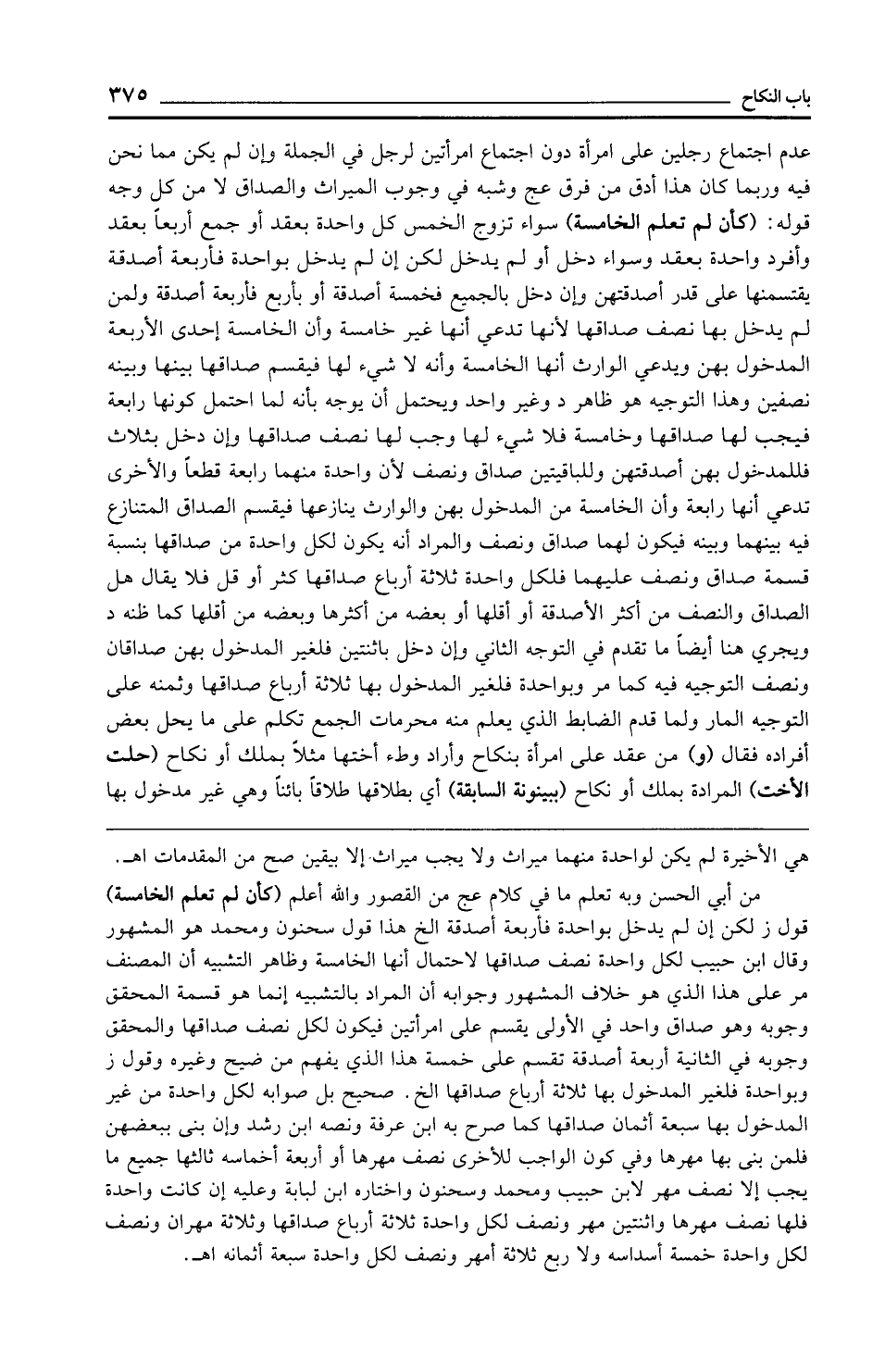 عدم اجتماع رجلين على امرأة دون اجتماع امرأتين لرجل في الجملة وإن لم يكن مما نحن فيه وربما كان هذا أدق من فرق عج وشبه في وجوب الميراث والصداق لا من كل وجه قوله: (كان لم تعلم الخامسة) سواء تزوج الخمس كل واحدة بعقد أو جمع أربعًا بعقد وأفرد واحدة بعقد وسواء دخل أو لم يدخل لكن إن لم يدخل بواحدة فأربعة أصدقة يقتسمنها على قدر أصدقتهن وإن دخل بالجميع فخمسة أصدقة أو بأربع فأربعة أصدقة ولمن لم يدخل بها نصف صداقها لأنها تدعي أنها غير خامسة وأن الخامسة إحدى الأربعة المدخول بهن ويدعي الوارث أنها الخامسة وأنه لا شيء لها فيقسم صداقها بينها وبينه نصفين وهذا التوجيه هو ظاهر د وغير واحد ويحتمل أن يوجه بأنه لما احتمل كونها رابعة فيجب لها صداقها وخامسة فلا شيء لها وجب لها نصف صداقها وإن دخل بثلاث فللمدخول بهن أصدقتهن وللباقيتين صداق ونصف لأن واحدة منهما رابعة قطعًا والأخرى تدعي أنها رابعة وأن الخامسة من المدخول بهن والوارث ينازعها فيقسم الصداق المتنازع فيه بينهما وبينه فيكون لهما صداق ونصف والمراد أنه يكون لكل واحدة من صداقها بنسبة قسمة صداق ونصف عليهما فلكل واحدة ثلاثة أرباع صداقها أكثر أو قل فلا يقال هل الصداق والنصف من أكثر الأصدقة أو أقلها أو بعضه من أكثرها وبعضه من أقلها كما ظنه د ويجري هنا أيضًا ما تقدم في التوجه الثاني وإن دخل باثنتين فلغير المدخول بهن صداقان ونصف التوجيه فيه كما مر وبواحدة فلغير المدخول بها ثلاثة أرباع صداقها وثمنه على التوجيه المار ولما قدم الضابط الذي يعلم منه محرمات الجمع تكلم على ما يحل بعض أفراده فقال (و) من عقد على امرأة بنكاح وأراد وطء أختها مثلًا بملك أو نكاح (حلت الأخت) المرادة بملك أو نكاح (ببينونة السابقة) أي بطلاقها طلاقًا بائنًا وهي غير مدخول بها