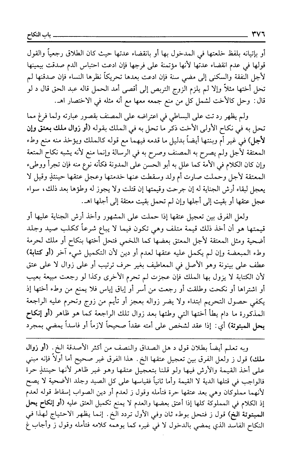 وبه تعلم أيضًا بطلان قول د هل الصداق والنصف من أكثر الأصدقة الخ. (أو زوال ملك) قول ز ولعل الفرق بين تعجيل عتقها الخ. هذا الفرق غير صحيح أما أولًا فإنه مبني على أخذ القيمة والأرش فيها ولو قلنا بتعجيل عتقها وهو غير ظاهر لأنها حينئذٍ حرة فالواجب في قتلها الدية لا القيمة وأما ثانيًا فقياسها على كل الصيد وجلد الأضحية لا يصح لأنهما مملوكان وهي بعد عتقها حرة فتأمله وقول ز لعدم أو دين الصواب إسقاط قوله لعدم إذ الكلام في المملوكة كلها إذا أعتق بعضها والعدم لا يمنع تكميل العتق عليه (أو إنكاح يحل المبتوتة الخ) قول ز فتحل بوطء ثان وفي الأول تردد الخ. إنما يظهر الاحتياج لهذا في النكاح الفاسد الذي يمضي بالدخول لا في غيره كما يوهمه كلامه فتأمله وقول ز وأجاب غ