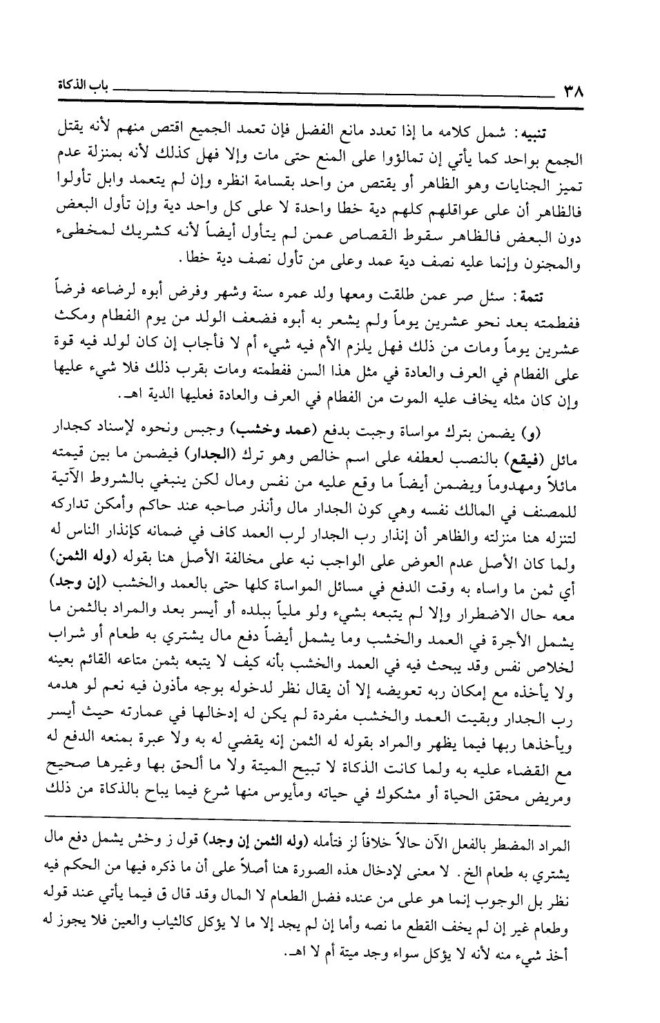 تنبيه: شمل كلامه ما إذا تعدد مانع الفضل فإن تعمد الجميع اقتص منهم لأنه يقتل الجمع بواحد كما يأتي إن تمالؤوا على المنع حتى مات وإلا فهل كذلك لأنه بمنزلة عدم يتميز الجنايات وهو الظاهر أو يقتص من واحد بقسامة انظره وإن لم يتعمد وابل تأولوا فالظاهر أن على عواقلهم كلهم دية خطأ واحدة لا على كل واحد دية وإن تأول البعض دون البعض فالظاهر سقوط القصاص عمن لم يتأول أيضًا لأنه كشريك لمخطىء والمجنون وإنما عليه نصف دية عمد وعلى من تأول نصف دية خطأ.