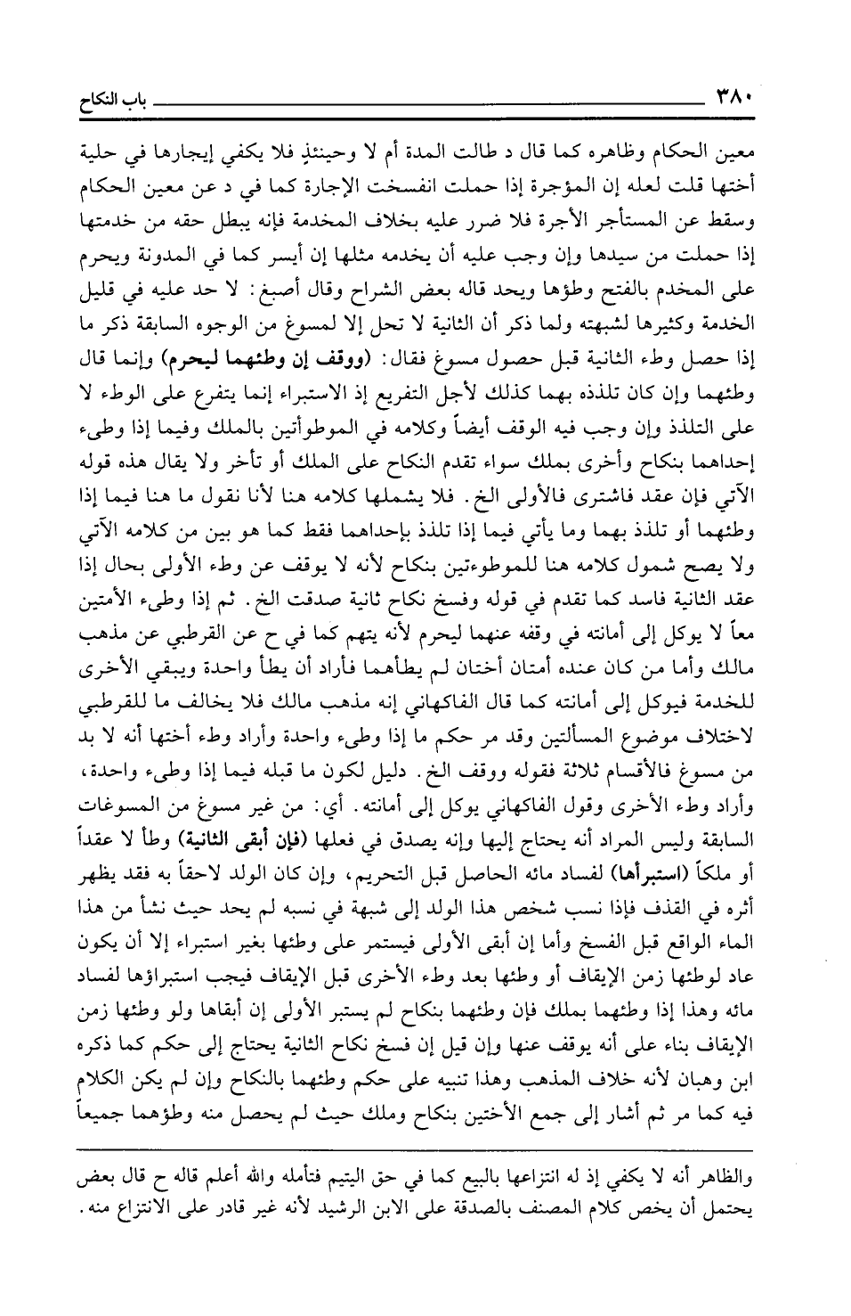معين الحكام وظاهره كما قال د طالت المدة أم لا وحينئذٍ فلا يكفي إيجارها في حلية أختها قلت لعله إن المؤجرة إذا حملت انفسخت الإجارة كما في د عن معين الحكام وسقط عن المستأجر الأجرة فلا ضرر عليه بخلاف المخدمة فإنه يبطل حقه من خدمتها إذا حملت من سيدها وإن وجب عليه أن يخدمه مثلها إن أيسر كما في المدونة ويحرم على المخدم بالفتح وطؤها ويحد قاله بعض الشراح وقال أصبغ: لا حد عليه في قليل الخدمة وكثيرها لشبهته ولما ذكر أن الثانية لا تحل إلا لمسوغ من الوجوه السابقة ذكر ما إذا حصل وطء الثانية قبل حصول مسوغ فقال: (ووقف إن وطئهما ليحرم) وإنما قال وطئهما وإن كان تلذذه بهما كذلك لأجل التفريع إذ الاستبراء إنما يتفرع على الوطء لا على التلذذ وإن وجب فيه الوقف أيضًا وكلامه في الموطوأتين بالملك وفيما إذا وطئ إحداهما بنكاح وأخرى بملك سواء تقدم النكاح على الملك أو تأخر ولا يقال هذه قوله الآتي فإن عقد فاشترى فالأولى الخ. فلا يشملها كلامه هنا لأنا نقول ما هنا فيما إذا وطئهما أو تلذذ بهما وما يأتي فيما إذا تلذذ بإحداهما فقط كما هو بين من كلامه الآتي ولا يصح شمول كلامه هنا للموطوءتين بنكاح لأنه لا يوقف عن وطء الأولى بحال إذا عقد الثانية فاسد كما تقدم في قوله وفسخ نكاح ثانية صدقت الخ. ثم إذا وطئ الأمتين معًا لا يوكل إلى أمانته في وقفه عنهما ليحرم لأنه يتهم كما في ح عن القرطبي عن مذهب مالك وأما من كان عنده أمتان أختان لم يطأهما فأراد أن يطأ واحدة ويبقي الأخرى للخدمة فيوكل إلى أمانته كما قال الفاكهاني إنه مذهب مالك فلا يخالف ما للقرطبي لاختلاف موضوع المسألتين وقد مر حكم ما إذا وطئ واحدة وأراد وطء أختها أنه لا بد من مسوغ فالأقسام ثلاثة فقوله ووقف الخ. دليل لكون ما قبله فيما إذا وطئ واحدة، وأراد وطء الأخرى وقول الفاكهاني يوكل إلى أمانته. أي: من غير مسوغ من المسوغات السابقة وليس المراد أنه يحتاج إليها وإنه يصدق في فعلها (فإن أبقى الثانية) وطأ لا عقدًا أو ملكًا (استبرأها) لفساد مائه الحاصل قبل التحريم، وإن كان الولد لاحقًا به فقد يظهر أثره في القذف فإذا نسب شخص هذا الولد إلى شبهة في نسبه لم يحد حيث نشأ من هذا الماء الواقع قبل الفسخ وأما إن أبقى الأولى فيستمر على وطئها بغير استبراء إلا أن يكون عاد لوطئها زمن الإيقاف أو وطئها بعد وطء الأخرى قبل الإيقاف فيجب استبراؤها لفساد مائه وهذا إذا وطئهما بملك فإن وطئهما بنكاح لم يستبر الأولى إن أبقاها ولو وطئها زمن الإيقاف بناء على أنه يوقف عنها وإن قيل إن فسخ نكاح الثانية يحتاج إلى حكم كما ذكره ابن وهبان لأنه خلاف المذهب وهذا تنبيه على حكم وطئهما بالنكاح وإن لم يكن الكلام فيه كما مر ثم أشار إلى جمع الأختين بنكاح وملك حيث لم يحصل منه وطؤهما جميعًا