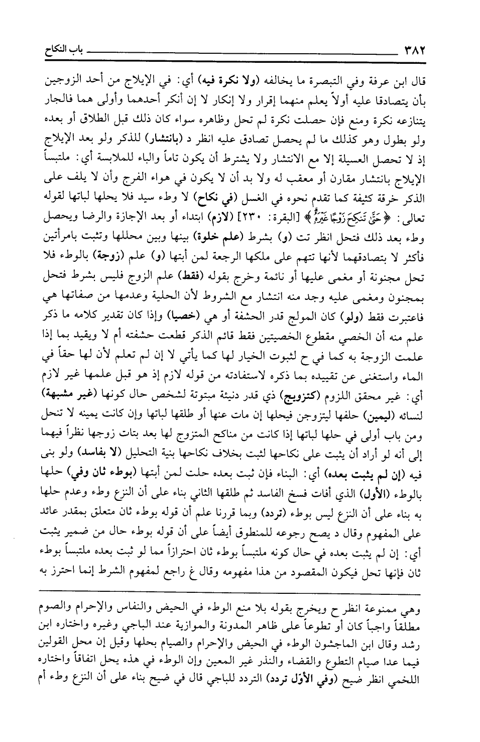 قال ابن عرفة وفي التبصرة ما يخالفه (ولا نكرة فيه) أي: في الإيلاج من أحد الزوجين بأن يتصادقا عليه أولًا يعلم منهما إقرار ولا إنكار لا إن أنكر أحدهما وأولى هما فالجار يتنازعه نكره ومنع فإن حصلت نكرة لم تحل وظاهره سواء كان ذلك قبل الطلاق أو بعده ولو بطول وهو كذلك ما لم يحصل تصادق عليه انظر د (بانتشار) للذكر ولو بعد الإيلاج إذ لا تحصل العسيلة إلا مع الانتشار ولا يشترط أن يكون تامًّا والباء للملابسة أي: ملتبسًا الإيلاج بانتشار مقارن أو معقب له ولا بد أن لا يكون في هواء الفرج وأن لا يلف على الذكر خرقة كثيفة كما تقدم نحوه في الغسل (في نكاح) لا وطء سيد فلا يحلها لباتها لقوله تعالى: {حَتَّى تَنْكِحَ زَوْجًا غَيْرَهُ} [البقرة: 230] (لازم) ابتداء أو بعد الإجازة والرضا ويحصل وطء بعد ذلك فتحل انظر تت (و) بشرط (علم خلوة) بينها وبين محللها وتثبت بامرأتين فأكثر لا بتصادقهما لأنها تتهم على ملكها الرجعة لمن أبتها (و) علم (زوجة) بالوطء فلا تحل مجنونة أو مغمى عليها أو نائمة وخرج بقوله (فقط) علم الزوج فليس بشرط فتحل بمجنون ومغمى عليه وجد منه انتشار مع الشروط لأن الحلية وعدمها من صفاتها هي فاعتبرت فقط (ولو) كان المولج قدر الحشفة أو هي (خصيا) وإذا كان تقدير كلامه ما ذكر علم منه أن الخصي مقطوع الخصيتين فقط قائم الذكر قطعت حشفته أم لا ويقيد بما إذا علمت الزوجة به كما في ح لثبوت الخيار لها كما يأتي لا إن لم تعلم لأن لها حقًّا في الماء واستغنى عن تقييده بما ذكره لاستفادته من قوله لازم إذ هو قبل علمها غير لازم أي: غير محقق اللزوم (كتزويج) ذي قدر دنيئة مبتوتة لشخص حال كونها (غير مشبهة) لنسائه (ليمين) حلفها ليتزوجن فيحلها إن مات عنها أو طلقها لباتها وإن كانت يمينه لا تنحل ومن باب أولى في حلها لباتها إذا كانت من مناكح المتزوج لها بعد بتات زوجها نظرًا فيهما إلى أنه لو أراد أن يثبت على نكاحها لثبت بخلاف نكاحها بنية التحليل (لا بفاسد) ولو بنى فيه (إن لم يثبت بعده) أي: البناء فإن ثبت بعده حلت لمن أبتها (بوطء ثان وفي) حلها بالوطء (الأول) الذي أفات فسخ الفاسد ثم طلقها الثاني بناء على أن النزع وطء وعدم حلها به بناء على أن النزع ليس بوطء (تردد) وبما قررنا علم أن قوله بوطء ثان متعلق بمقدر عائد على المفهوم وقال د يصح رجوعه للمنطوق أيضًا على أن قوله بوطء حال من ضمير يثبت أي: إن لم يثبت بعده في حال كونه ملتبسًا بوطء ثان احترازًا مما لو ثبت بعده ملتبسًا بوطء ثان فإنها تحل فيكون المقصود من هذا مفهومه وقال غ راجع لمفهوم الشرط إنما احترز به