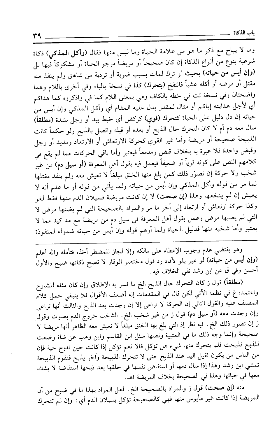 وما لا يباح مع ذكر ما هو من علامة الحياة وما ليس منها فقال (وأكل المذكي) ذكاة شرعية بنوع من أنواع الذكاة إن كان صحيحًا أو مريضًا مرجو الحياة أو مشكوكًا فيها بل (وإن أيس من حياته) بحيث لو ترك لمات بسبب ضربة أو تردية من شاهق ولم ينفذ منه مقتل أو مرضه أو أكله عشبًا فانتفخ (بتحرك) كذا في نسخة بالباء وفي أخرى باللام وهما واضحتان وفي نسخة تت في خطه بالكاف وهي بمعنى اللام كما في واذكروه كما هداكم أي لأجل هدايته إياكم أو مثال لمقدر يدل عليه المقام أي وأكل المذكي وإن أيس من حياته إن دل دليل على الحياة كتحرك (قوي) كركض أي خبط بيد أو رجل بشدة (مطلقًا) سال معه دم أم لا كان التحرك حال الذبح أو بعده أو قبله واتصل بالذبح ولو حكمًا كانت الذبيحة صحيحة أو مريضة وأما غير القوي كحركة الارتعاش أو الارتعاد ومديد أو رجل وقبض واحدة فلا عبرة به بخلاف قبض ومدمعًا فيعتبر وأما باقي الحركات مما لم يقع في كلامهم النص على كونه قويًّا أو ضعيفًا فيعمل فيه يقول أهل المعرفة (أو سيل دم) من غير شخب ولا حركة إن تصوّر ذلك كمن بلغ منها الخنق مبلغًا لا تعيش معه ولم ينفد مقتلها لما مر من قوله وأكل المذكي وإن أيس من حياته ولما يأتي من قوله أو ما علم أنه لا يعيش إن لم ينخعها وهذا (إن صحت) لا إن كانت مريضة فسيلان الدم منها فقط لغو وكذا حركة ارتعاش أو ارتعاد إلى آخر ما مر والمراد بالصحيحة التي لم يضنها مرض لا التي لم يصبها مرض وعمل بقول أهل المعرفة في سيل دم من مريضة مع مد كيد مما لا يعتبر وأما شخبه منها فدليل الحياة ولما أوهم قوله وإن أيس من حياته شموله لمنفوذة