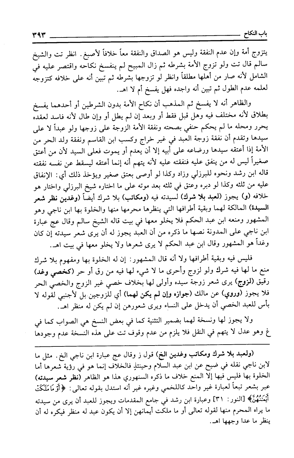 يتزوج أمة وإن عدم النفقة وليس هو الصداق والنفقة معًا خلافًا لأصبغ. انظر تت والشيخ سالم قال تت ولو تزوج الأمة بشرطه ثم زال المبيح لم ينفسخ نكاحه واقتصر عليه في الشامل لأنه صار من أهلها مطلقًا وانظر لو تزوجها بشرطه ثم تبين أنه على خلافه كتزوجه لعلمه عدم الطول ثم تبين أنه واجده فهل يفسخ أم لا اهـ.