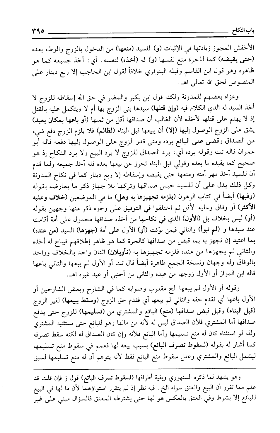 وعزاه بعضهم للمدونة ولكنه قول ابن بكير والمضر في حق الله إسقاطه للزوج لا أخذ السيد له الذي الكلام فيه (وإن قتلها) سيدها بني الزوج بها أم لا ويتكمل عليه بالقتل إذ لا يهتم على قتلها لأخذه لأن الغالب أن صداقها أقل من ثمنها (أو باعها بمكان بعيد) يشق على الزوج الوصول إليها (إلا) أن يبيعها قبل البناء (لظالم) فلا يلزم الزوج دفع شيء من الصداق وقضى على البائع برده ومتى قدر الزوج على الوصول إليها دفعه قاله أبو عمران قاله تت وقوله برده أي: برد الصداق للزوج لا برد البيع ولا برد النكاح إذ هو صحيح كما يفيده ما بعده وقولي قبل البناء تحرز عن بيعها بعده فله أخذ جميعه ولما قدم أن للسيد أخذ مهر أمته ومنعها حتى يقبضه وإسقاطه إلا ربع دينار كما في نكاح المدونة وكل ذلك يدل على أن للسيد حبس صداقها وتركها بلا جهاز ذكر ما يعارضه بقوله (وفيها) أيضًا في كتاب الرهون (يلزمه تجهيزها به وهل) ما في الموضعين (خلاف وعليه أكثر) أو وفاق وعليه الأقل ثم اختلفوا في التوفيق على وجوه ذكر منها وجهين بقوله (أو) ليس بخلاف بل (الأول) الذي في نكاحها من أخذه صداقها محمول على أمة أقامت عند سيدها و (لم تبوأ) والثاني فيمن بؤئت (أو) الأول على أمة (جهزها) السيد (من عنده) بما اعتيد إن تجهز به بما قبض من صداقها كالحرة كما هو ظاهر إطلاقهم فيباح له أخذه والثاني لم يجهزها من عنده فلزمه تجهيزها به (تأويلان) اثنان واحد بالخلاف وواحد بالوفاق وله وجهان ونسخة الجمع ظاهرة أيضًا قال تت أو الأول لم يبعها والثاني باعها قاله ابن المواز أو الأول زوجها من عبده والثاني من أجنبي أو عبد غيره اهـ.
